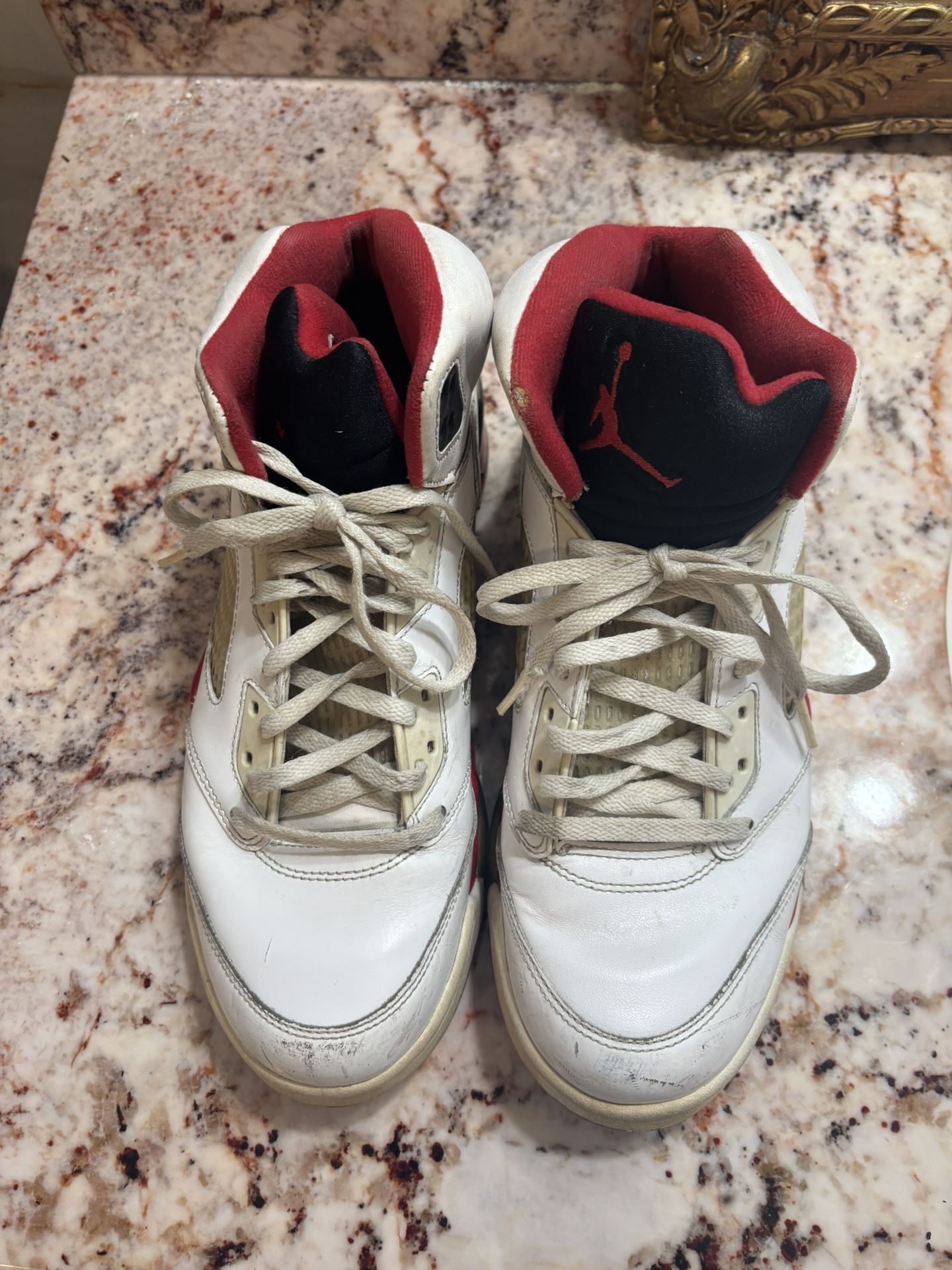 Jordan 5 “Fire Red” – Size 8.5 Used condition. Heavy wear — please check photos. • Yellowing on soles • Creasing + scratches on leather • Lining wear • Jumpman fading • Heel drag • No box Still wearable. Great beater, gym shoe, or full restoration project. Priced to move. Ships same/next day.