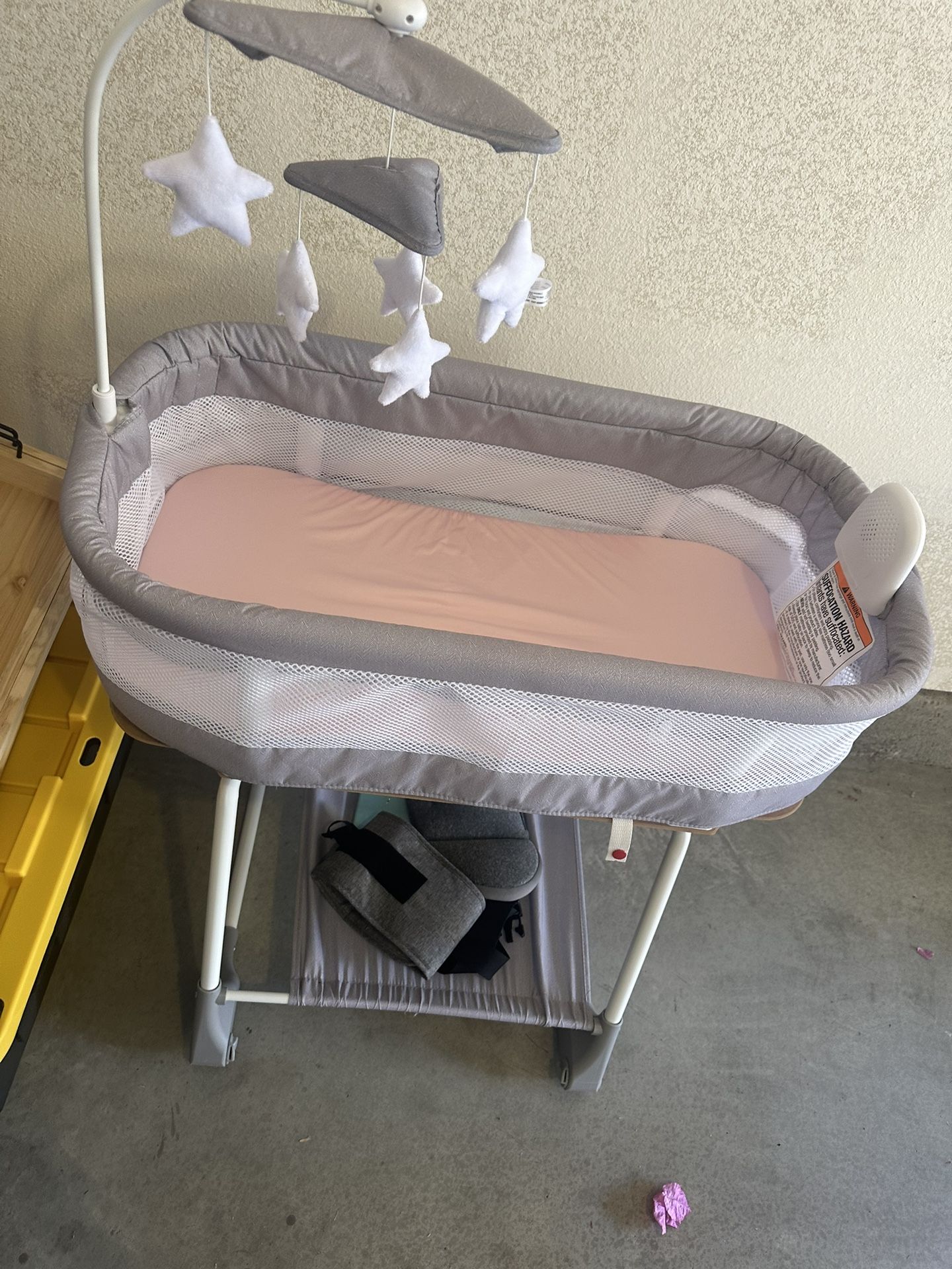 Has light, sounds and vibration. Has a soothing rock. Has mesh sides. Able to put diapers under for easy access. Easily portable, not heavy. Not used much, would use with blanket over when used. Baby slept on bed. Assembled dimensions: 32.5"L x 22"W x 47"H | Mattress pad size: 30.7"L x 15.6"W x 1"H | Weight: 13.7 lbs. | Bassinet includes mattress pad and fitted sheet