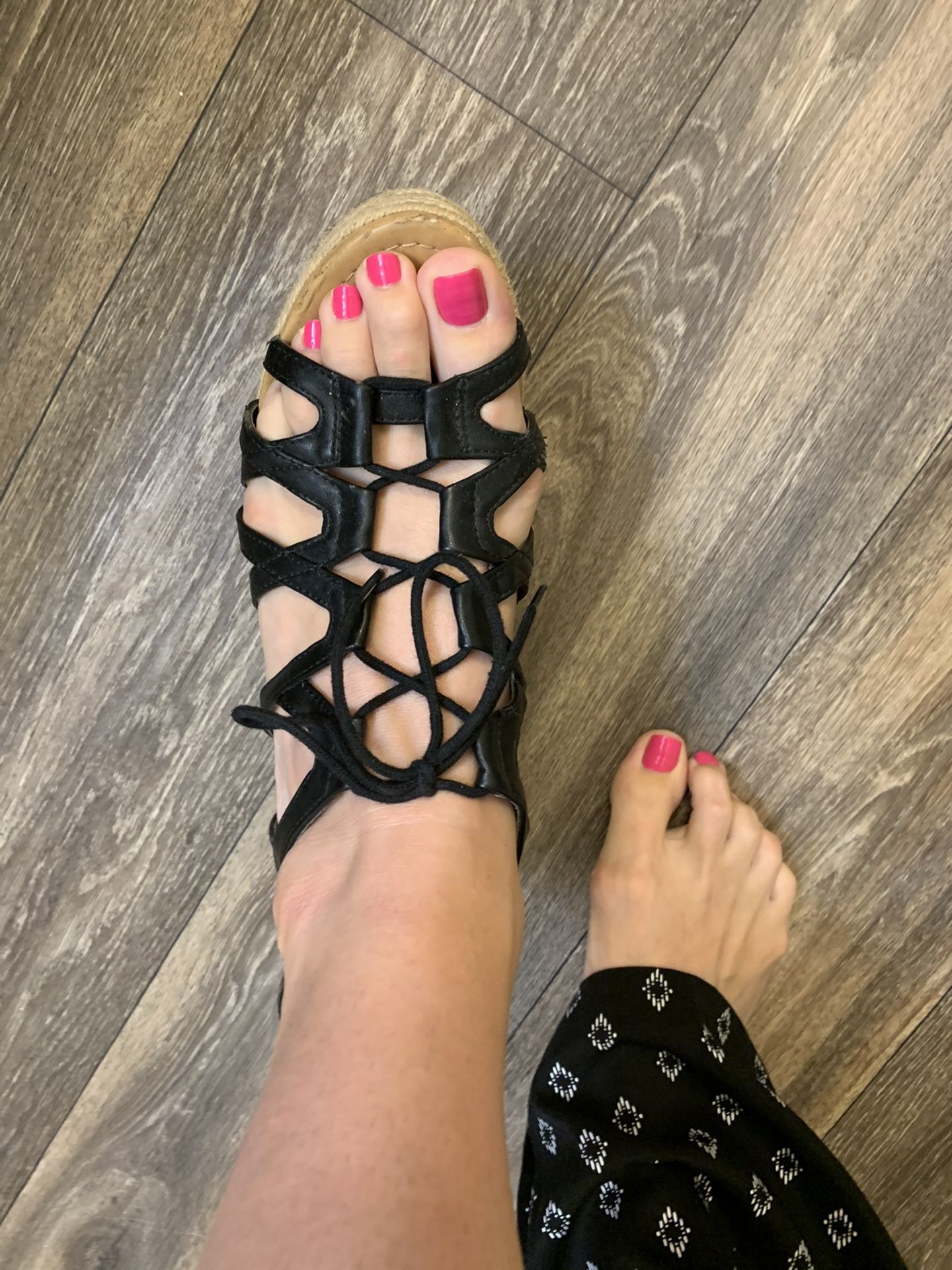 Size 10 wedges with adjustable back strap and adjustable tie in front to shape to your foot width. No tears in the leather straps. A little worn on the base, but just small areas you wouldn’t see when wearing. Super comfortable!