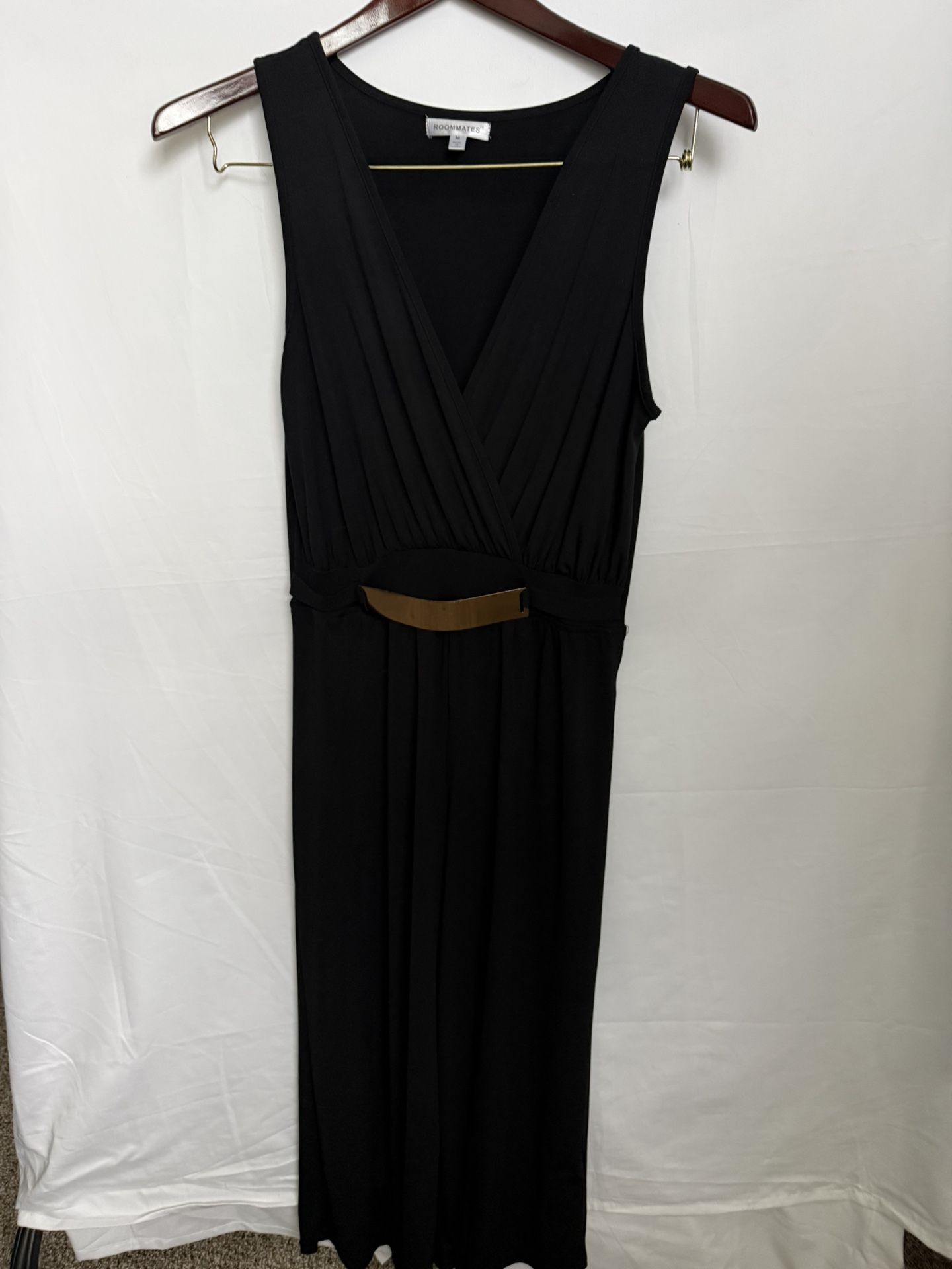 Elegant black sleeveless jumpsuit by Roommates, size Medium. Features a flattering deep V-neck wrap-style bodice with soft pleating, a defined waist with decorative belt accent, and wide flowing legs. Lightweight, stretchy fabric with a beautiful drape that moves nicely and feels comfortable. Perfect for evening events, parties, cocktail occasions, weddings, dinners, or dressy casual wear. Classic black color makes it easy to style with heels, sandals, or statement jewelry. Details: • Brand: Roommates • Size: M (Medium) • Color: Black • Style: Sleeveless, V-neck, Wide Leg • Condition: Good pre-owned condition • Made in China Stylish, timeless, and versatile piece for any wardrobe.
