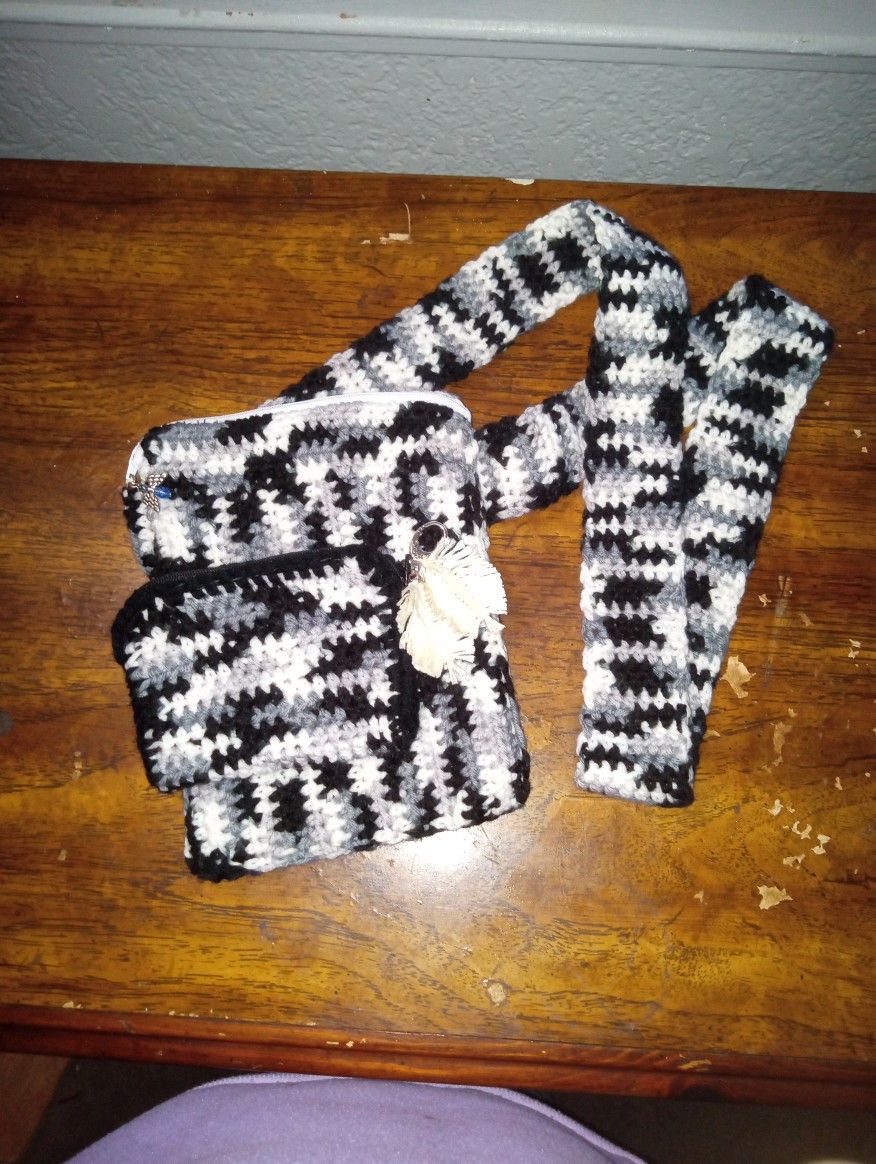 Black, white, an gray cross body bag an card holder with white feathers and a sliver clip to put it any where on the bag.