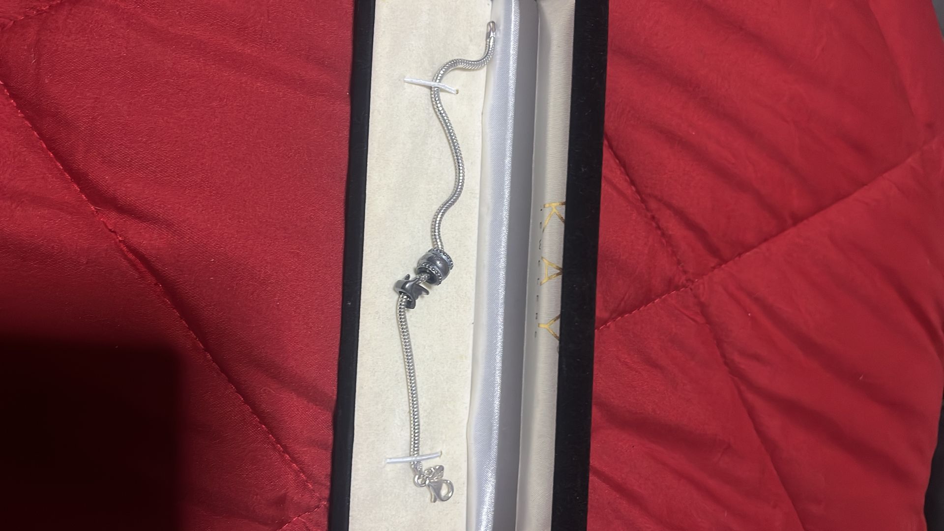 It’s a bracelet with an anniversary charm and I love you hand charm. It is 925 real silver from Italy bought from Kay’s jewelers perfect for your upcoming anniversary. The round charm says happy anniversary with a heart on it.