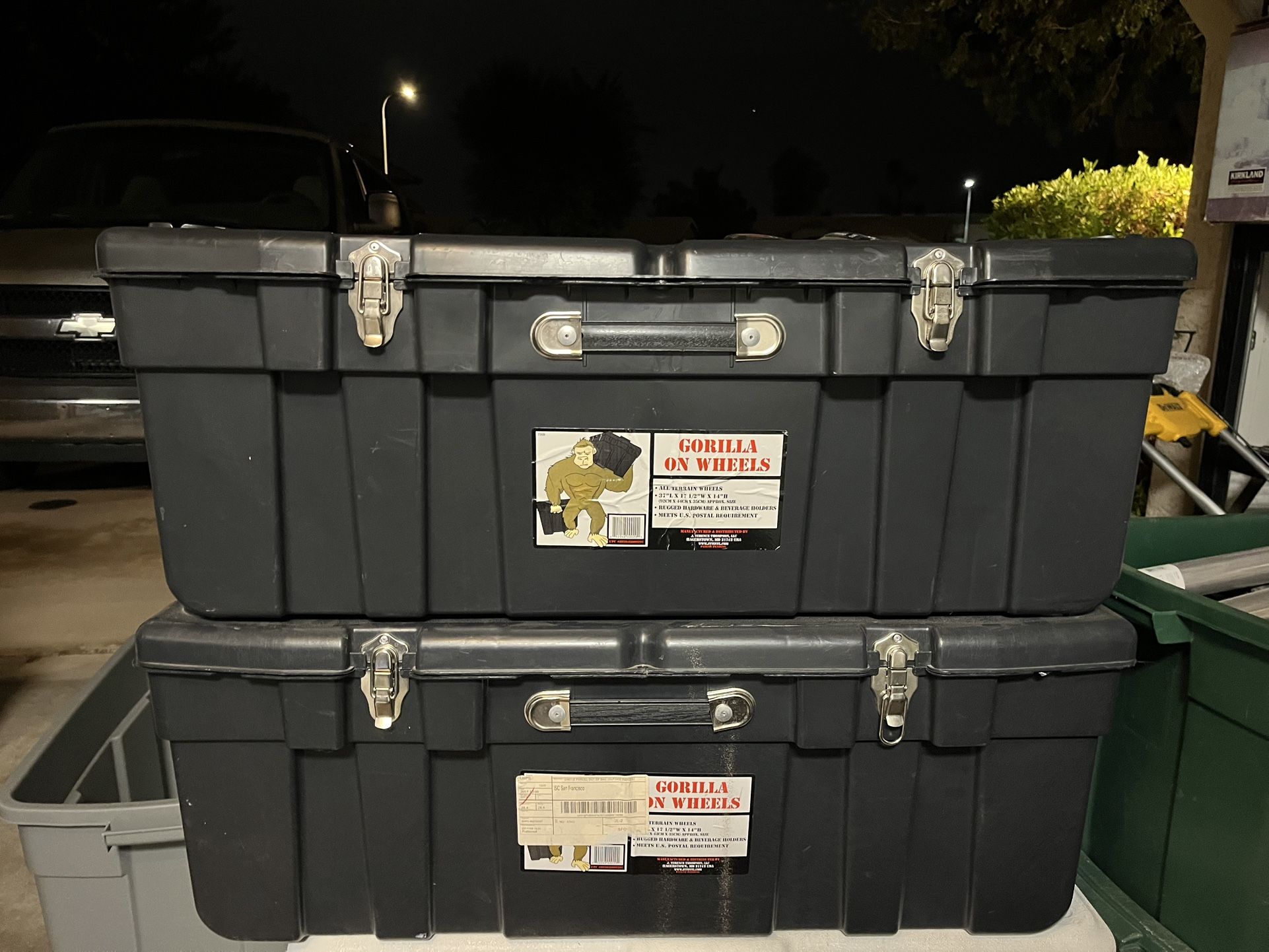 Two heavy duty Gorilla on Wheels storage trunks. Both in excellent condition with no cracks or fading.