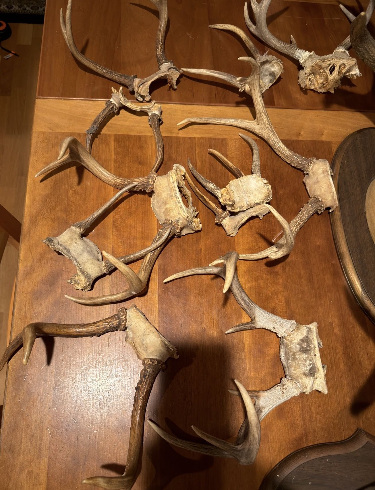 Large bulk lot of real deer antler skull caps. Mixed sizes and conditions. Sold exactly as shown. Quantity (10) Perfect for chandeliers, rustic decor, crafts, resale, or cabin projects. Selling as one lot only. Not separating. Local pickup only.