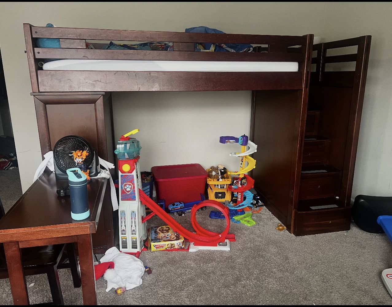Cherry Oak wood Loft Bed with storage and attached desk. (Mattress not included) Must be able to come pick it up within 24hrs of purchase. Please contact for any additional information or if you have any questions. Serious inquired ONLY!