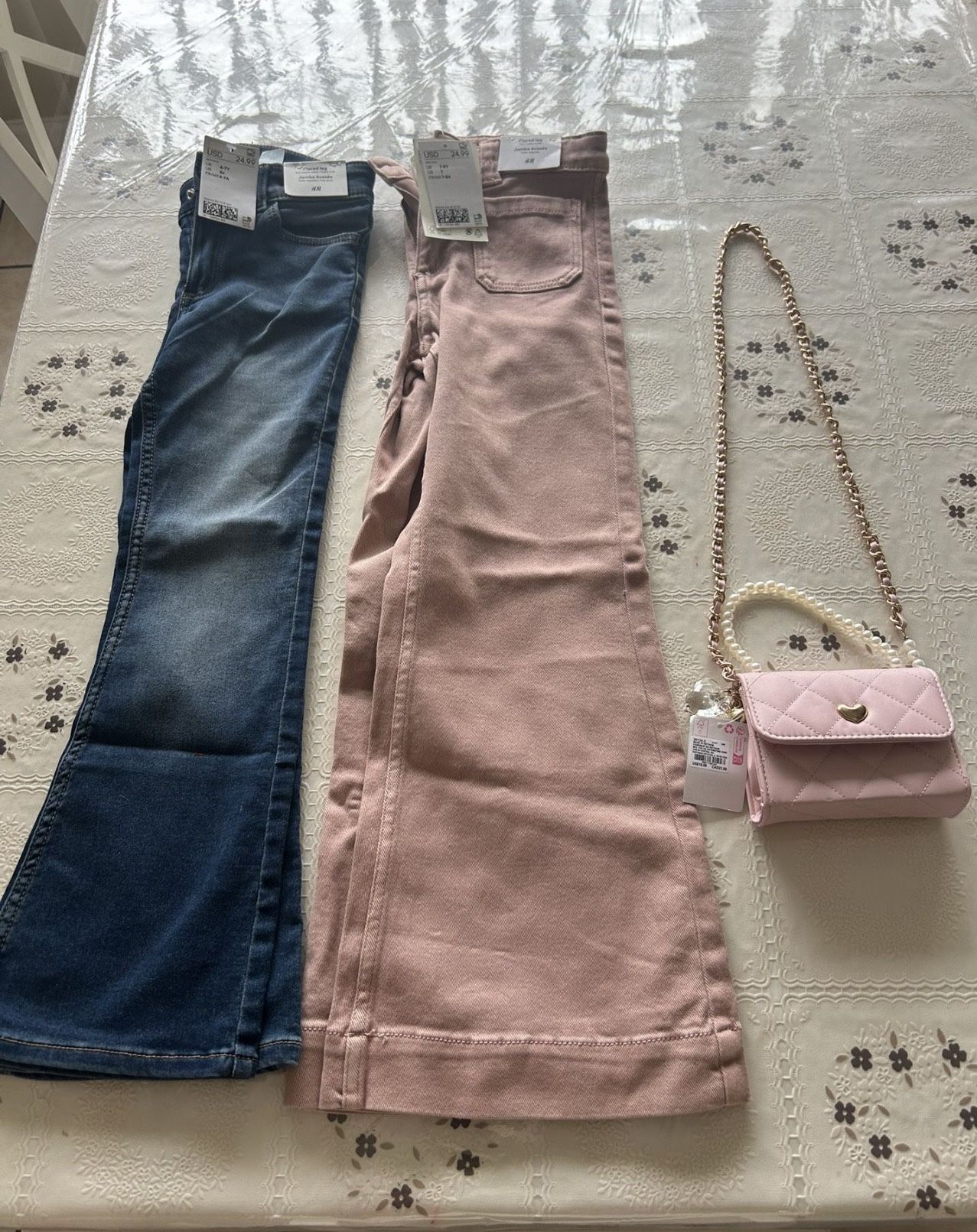 Girls New kids pants. Pink jeans is size 7-8Y Blue jeans is size 6-7 Y New pink purse Take all for $40