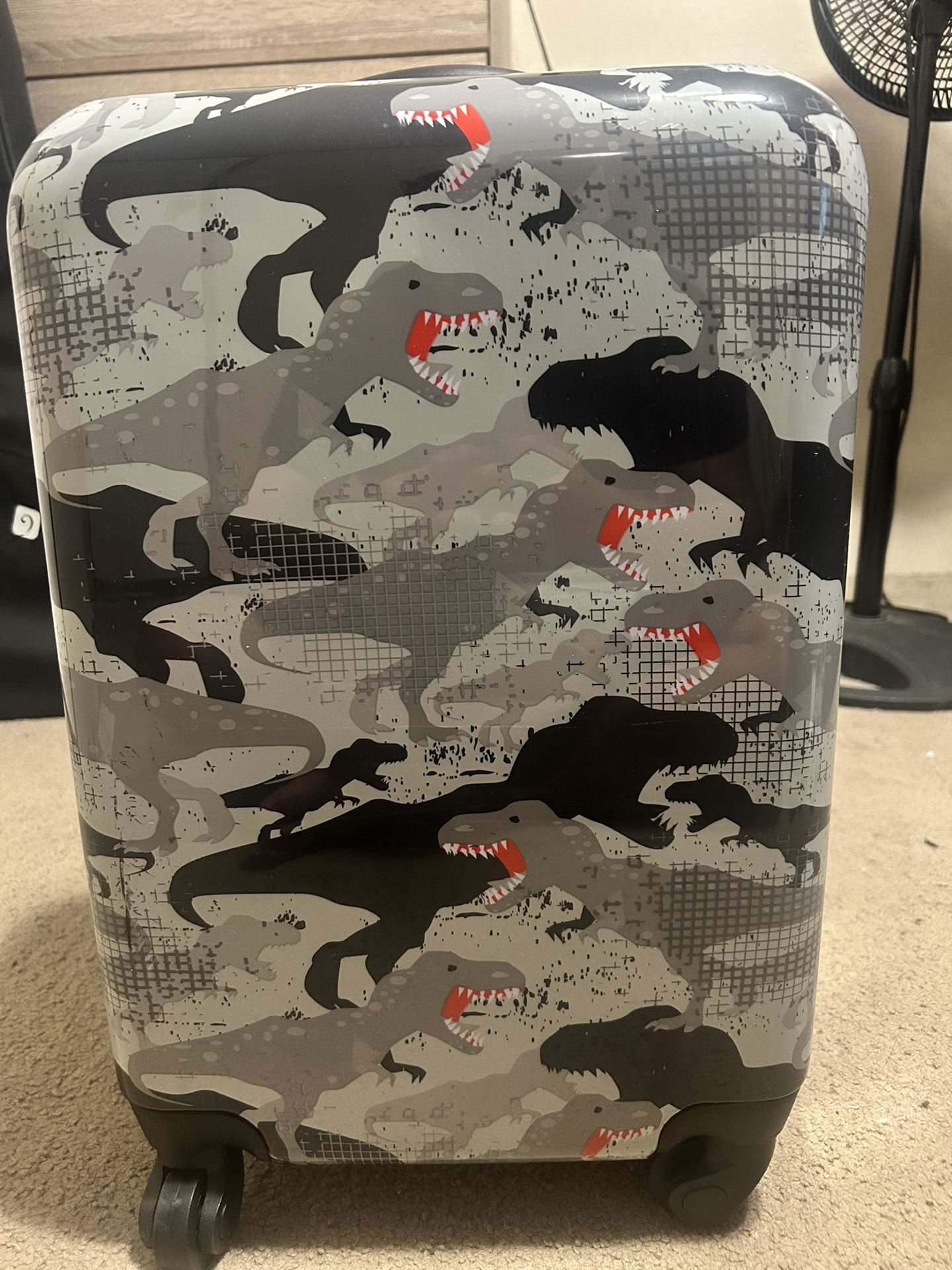 Hard shell kids suitcase in very good condition. Clean inside and out with minimal signs of use. Wheels roll smoothly and zipper works perfectly. Gray design with dinosaur print. Interior lining is clean with no rips or stains. Great for travel, sleepovers, or storage. Please see photos for condition details. Feel free to message me with any questions.