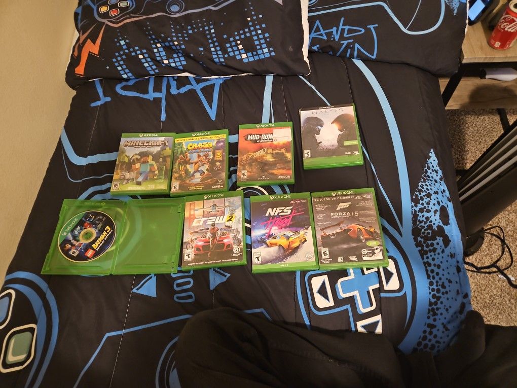 The crew 2, minecraft, forza mortorsport 5, nfs heat, crash bandicoot, halo 5, mud runner, batman 3