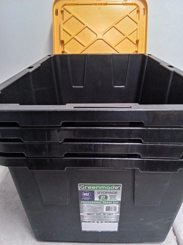 Four (4) Greenmade 27 Gallon storage tote with yellow lids for sale. Price is for all four. Used but in very good condition. Dimensions with Lid- 30.25"L x 20.25"W x 14.75"H Padlock holes for locking Stackable, Raised Bottom Reinforced Lid NSF Certified Made in the USA
