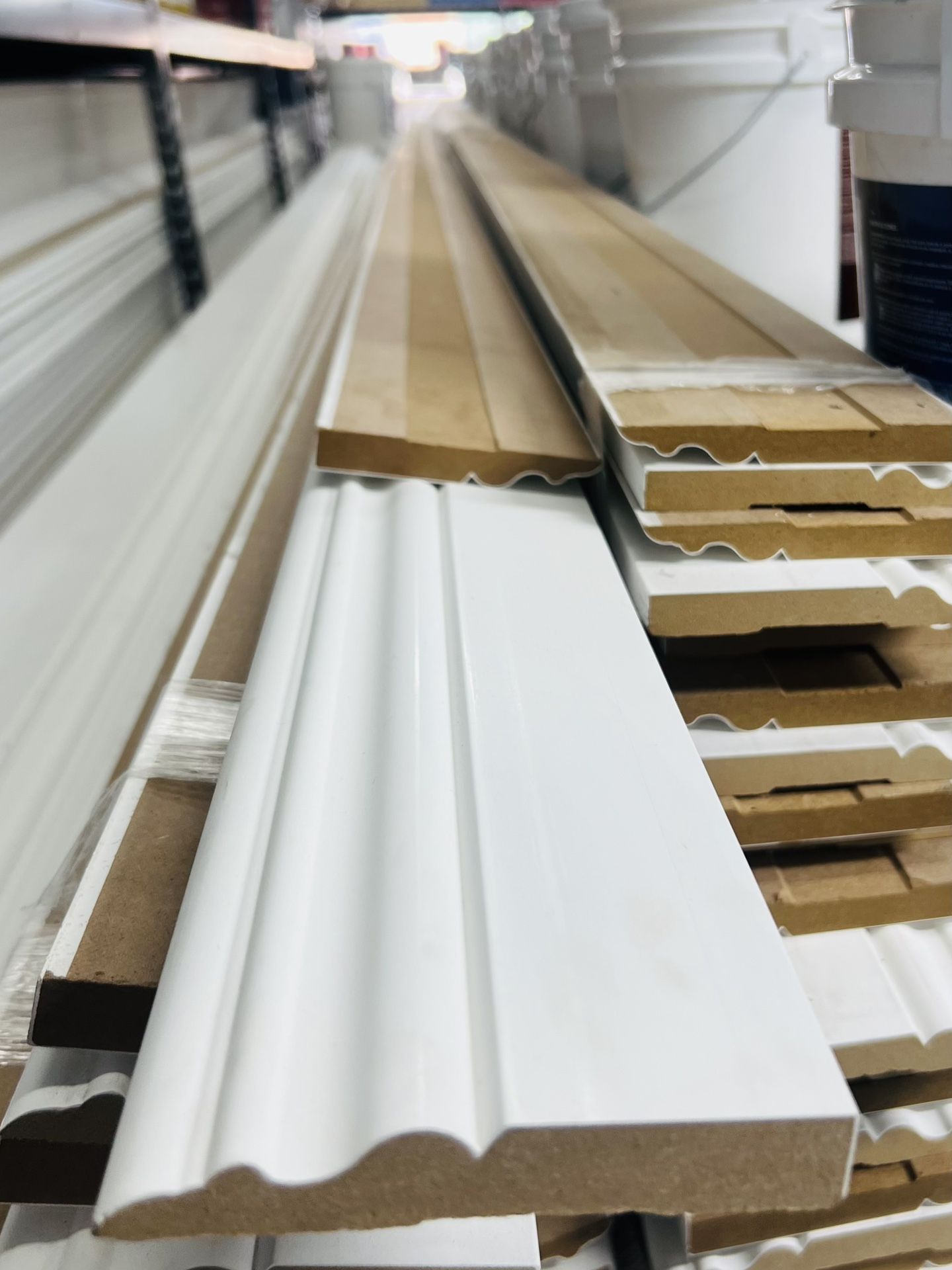 Squared 3 1/2 x 16ft $10.99 4 1/2 x 16ft $12.99 5 1/2 x 16ft $14.99 Design 3 1/2 x 16 ft $10.99 4’ x 16 ft $12.99 5’ x 16 ft $14.99 Door casing 2’ 1/2 x 17ft $13.99 Crown Moulding 5’ x 16ft $24.99