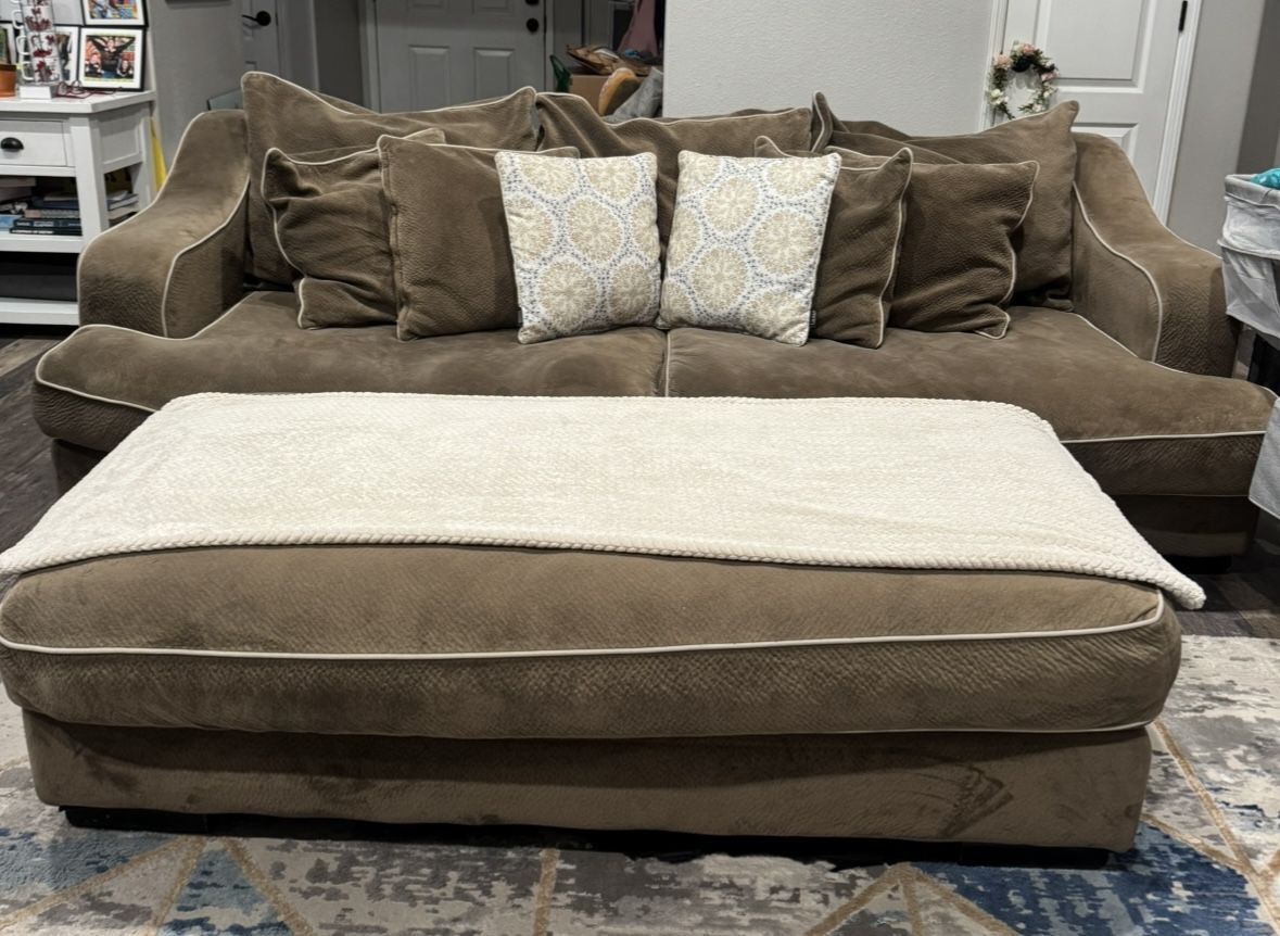 Very comfy sofa with a chaise / oversized chair) from Emerald Home Furnishings Pillows are foam and Down Bottom cushion and chaise are Foam/Fiber core with loose feather/down outer wrap You can remove seat and pillow covering and machine wash. Normal wear and tear Length 7’10” Width 3’10” Height 2’7”