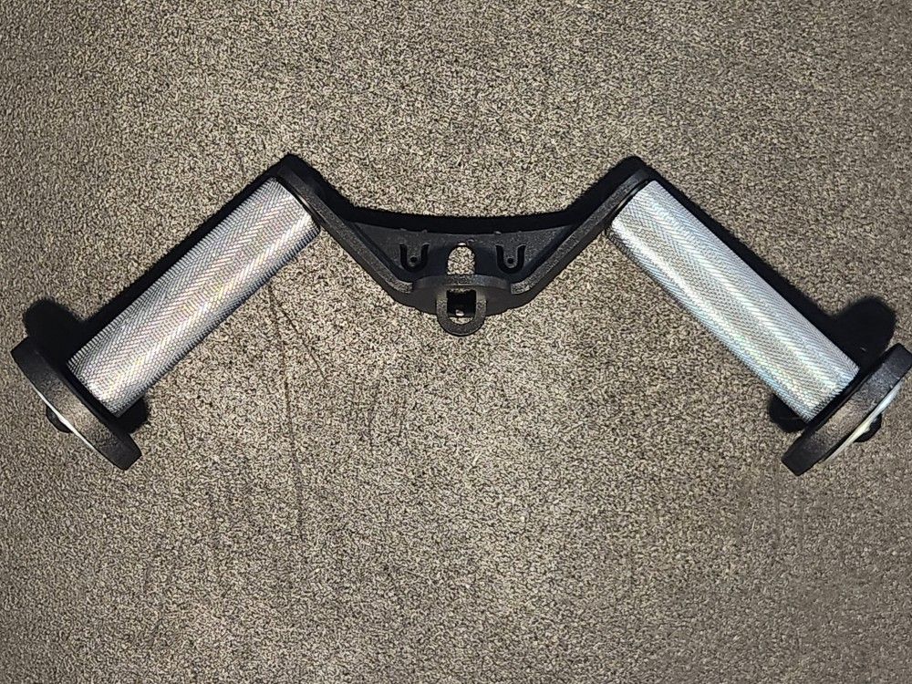 Uclips W Grip in very good condition (lightly used) - 45-degree angled handles - freely rotating handles - dual orientation attachment design for triceps or biceps exercises (semi-pronated or semi-supinated grip) - 32 mm stainless steel handles - 70 mm acrylic stops at bottom of handles - 330 lbs weight capacity