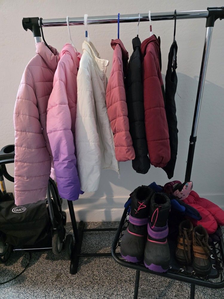 Girl jackets 5$ *Pink size 14/16 *Darker pink size 7/8 Fleece girl jackets 10$ *white size 10/12 *pink/purple size 14/16 Boy jackets *red/black fleece size 7/8 - 10 $ *Black jacket size 7/8- 5$ New baby snow bib black 12 to 18 months 8$ Boots size 5c toddler 5$ Snow boots *Size 5 purple -5$ Variety kids gloves black ones are adult purple small women will fit too 3$