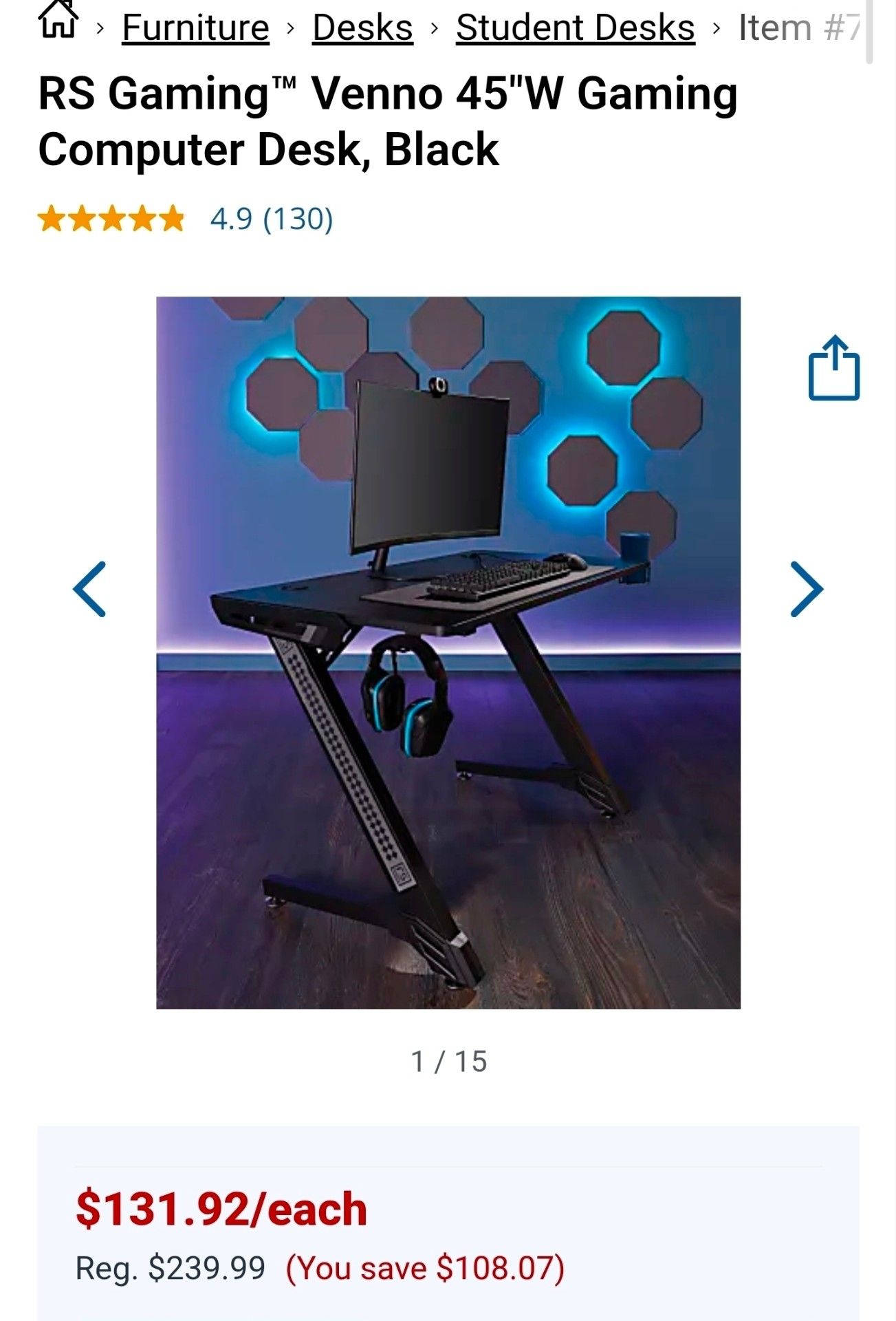 OBO RS Gaming™ Venno 45"W Gaming Computer Desk, Black