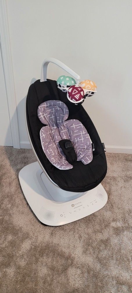 Gently used. Comes with all the pieces and a newborn insert. Seat reclines to lay almost flat. Lots of different motions and sounds, plays music with a bluetooth connection and works with the 4moms app. No rips or stains. Smoke and pet free home. Cash only, pick up in Merrillville, IN.