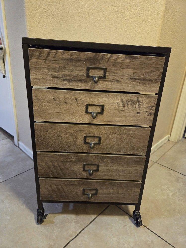 Five drawer storage on wheels. 27" high, 16.5" wide, 16" deep. Gently used. Smoke free, pet free home. Cash only. See additional listing with matching desk.
