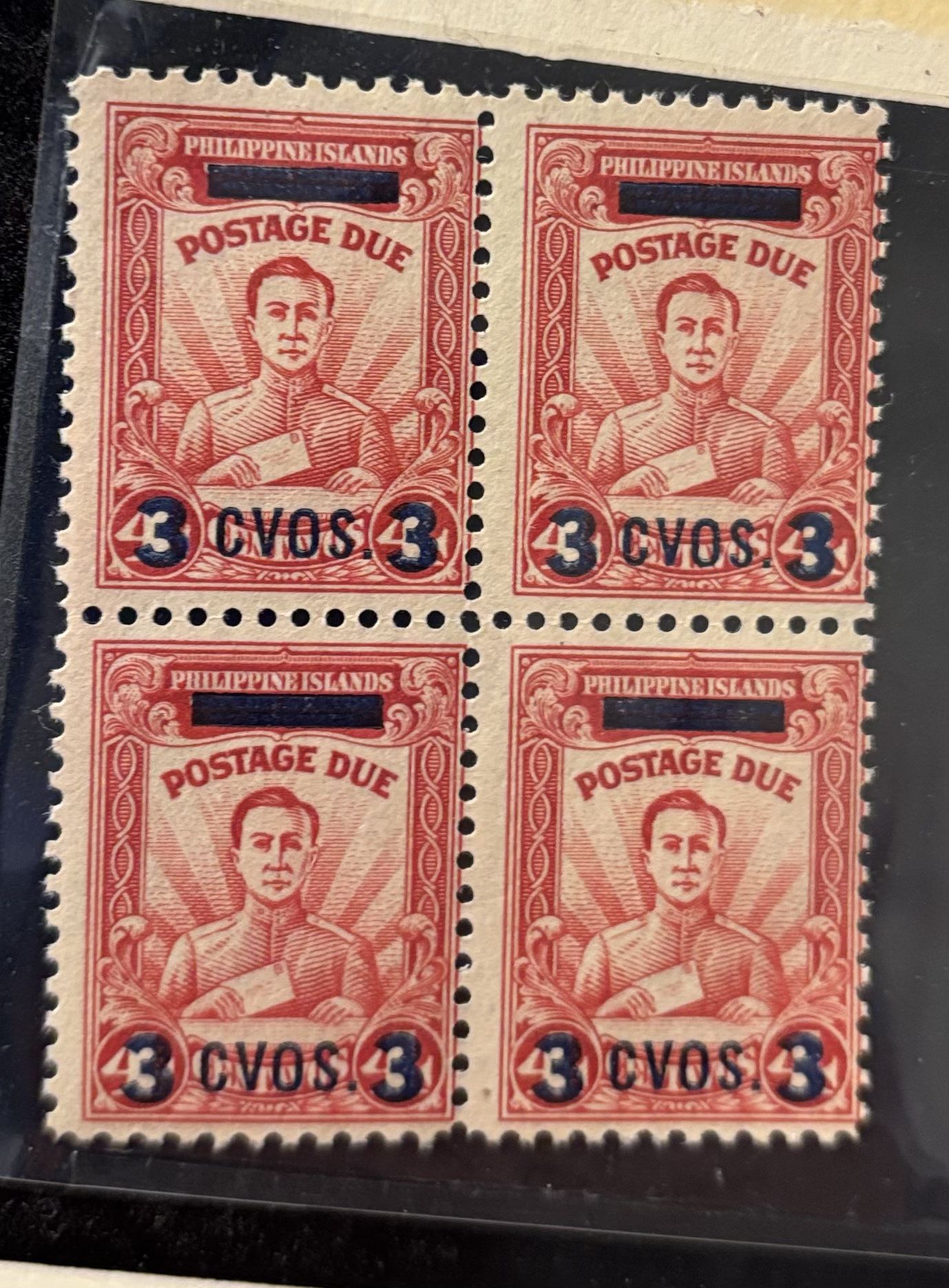 Stamp Details Identification: These stamps are part of the Japanese Occupation issues of the Philippines. They feature a "Post Office Clerk" design in brown-red, which has been overprinted. Overprint Features: Blue Bar: A solid blue horizontal bar covers the original "United States of America" text at the top. Value Change: The original denomination is overprinted with "3 CVOS" (3 centavos) in blue. Historical Context These postage due stamps were issued on October 14, 1942, during the Japanese occupation of the Philippines in World War II. They were created by overprinting existing stock of the 1928 4c brown-red postage due stamps to adjust for new postal rates and remove references to the United States.