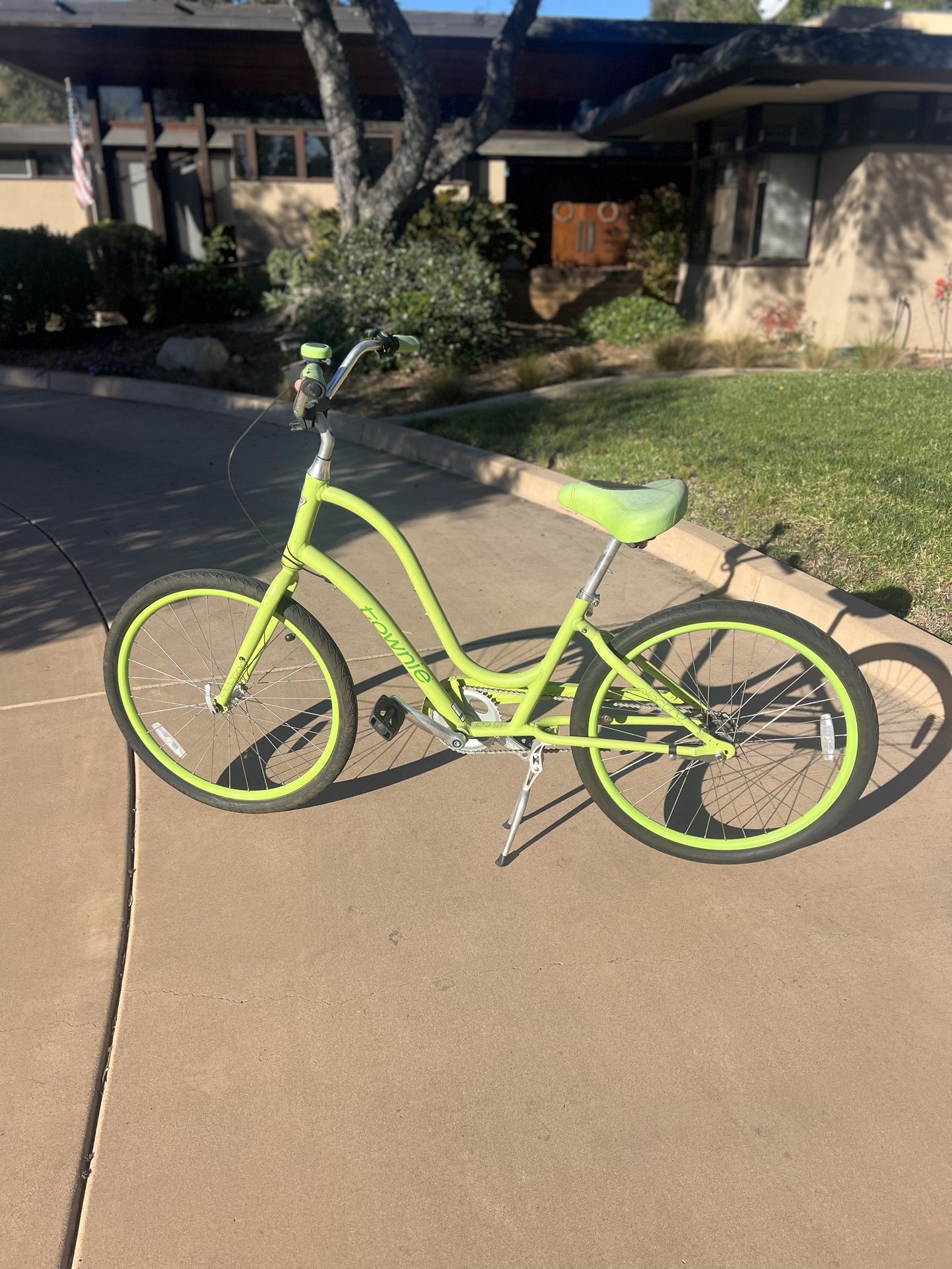Fun TOWNIE cruiser. Lime green. Great condition. Frame, tires, brakes very strong. Cool English style kick-stand. Just needs a little elbow grease to clean it up to almost new.