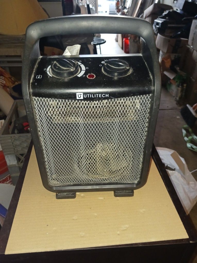 Fan-assisted electric utility heater. Light weight and easy to use. Adjustable heat temperature and adjustable fan speed. Ideal for small rooms up to 200 square ft.