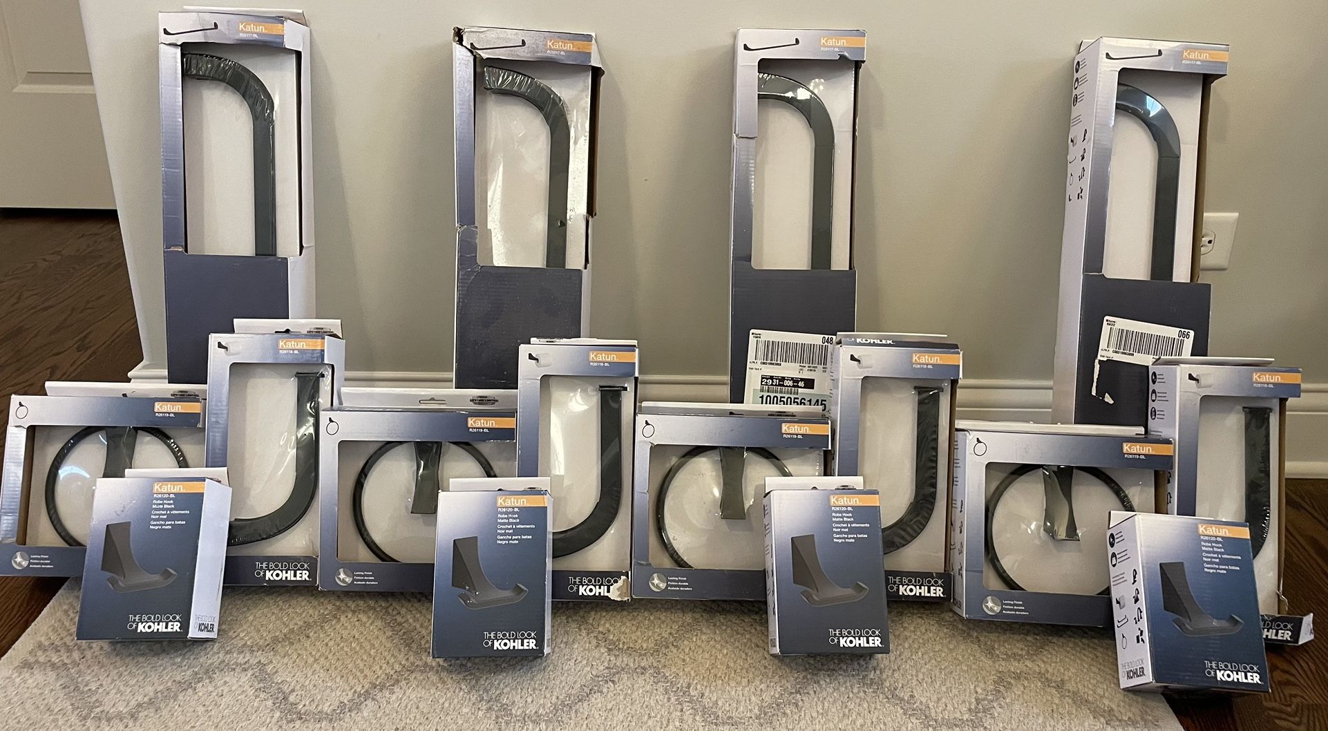 4 sets available. Brand new. Individual prices listed below KOHLER Katun 24 in. Wall Mount Towel Bar in Matte Black- $20 KOHLER Katun Towel Ring in Matte Black- $20 KOHLER Katun Wall Mounted Toilet Paper Holder in Matte Black- $25 KOHLER Katun Robe Hook in Matte Black- $15 *Premium metal construction for durability and reliability *KOHLER finishes resist corrosion and tarnishing *Lifetime limited warranty *Installation hardware included *Coordinates with all other products in the Katun collection