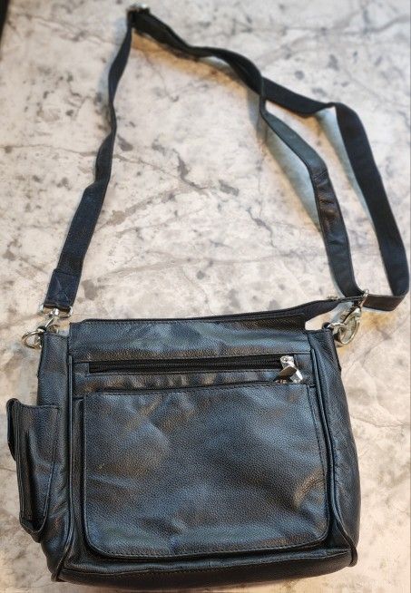 Black Leather Crossbody Conceal Carry Handbag $40 obo New, never used. Secure anti-theft handbags for ultimate peace of mind. Personal preparedness is now an essential part of modern life, particularly for women with their busy schedules and moving around. Universal Velcro Holster, expertly designed for adjustable draw and a secure fit for virtually all firearm models. YKK Locking Zippers. Feel secure with our lockable compartment. Ambidextrous Concealment. Designed for both right- and left-handed users, ensuring effortless access for a quick and reliable draw when every moment counts.