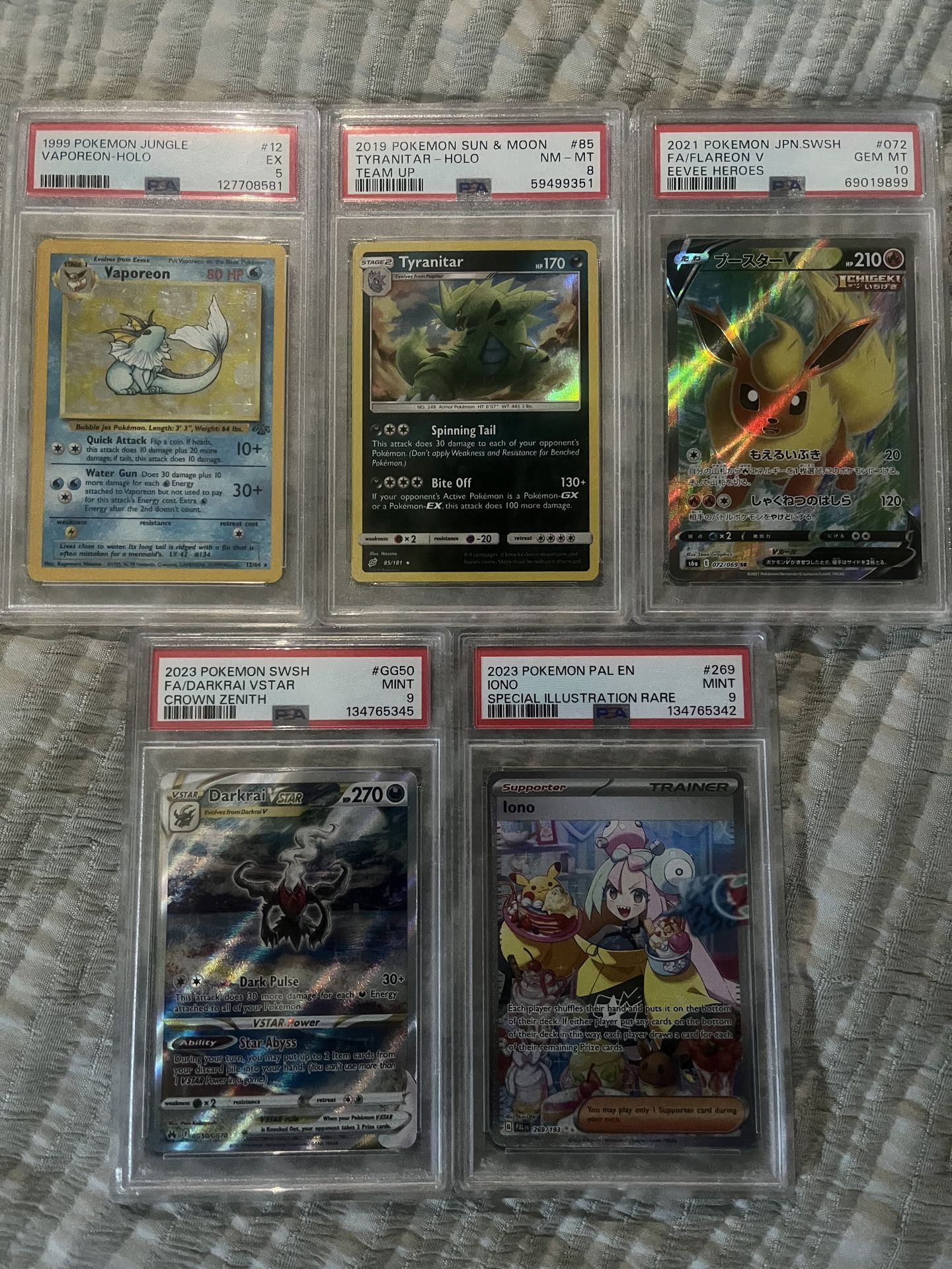 Tyranitar team up holo PSA 8-$20 Darkrai vstar PSA 9-$55 Flareon V PSA 10-$50 Vaporeon jungle holo PSA 5-$30 Iono SIR PSA 9-$55 $200 for the lot