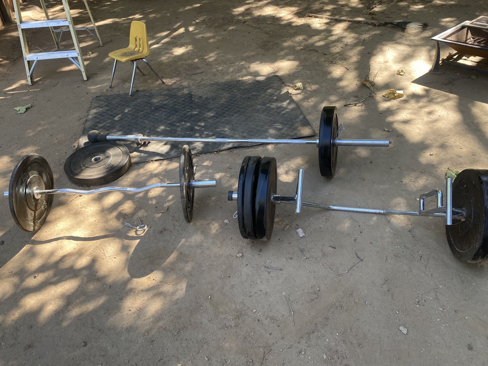 240 LB in bumper plates One 45 LB olympic bar One 25 curl bar One 45 deadlift bar 355 LB total