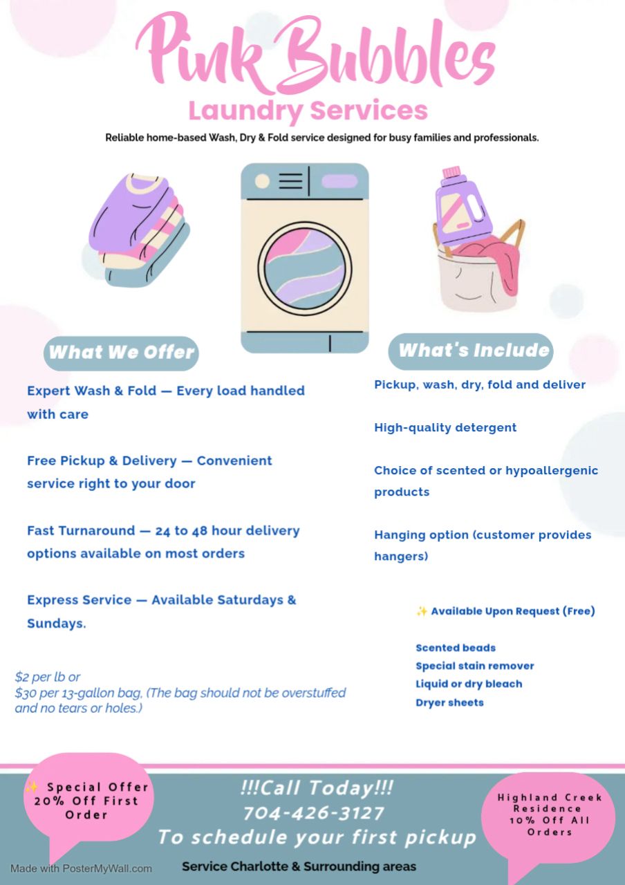 Pink Bubbles Laundry Services We Offer Expert Wash & Fold — Every load handled with care. Free Pickup & Delivery — Convenient service right to your door. Fast Turnaround — 24 to 48 hour delivery options available on most orders. Express Service — Available Saturdays & Sundays. What’s Included Pickup, wash, dry, fold and deliver Hanging option (customer provides hangers) High‑quality detergent Choice of scented or hypoallergenic products Available Upon Request (Free) Scented beads Special stain remover Liquid or dry bleach Dryer sheets $2 per lb or $30 per13‑gallon bag !!!Call Today!!! (contact info removed) to schedule your first pickup Serving Charlotte & Surrounding areas