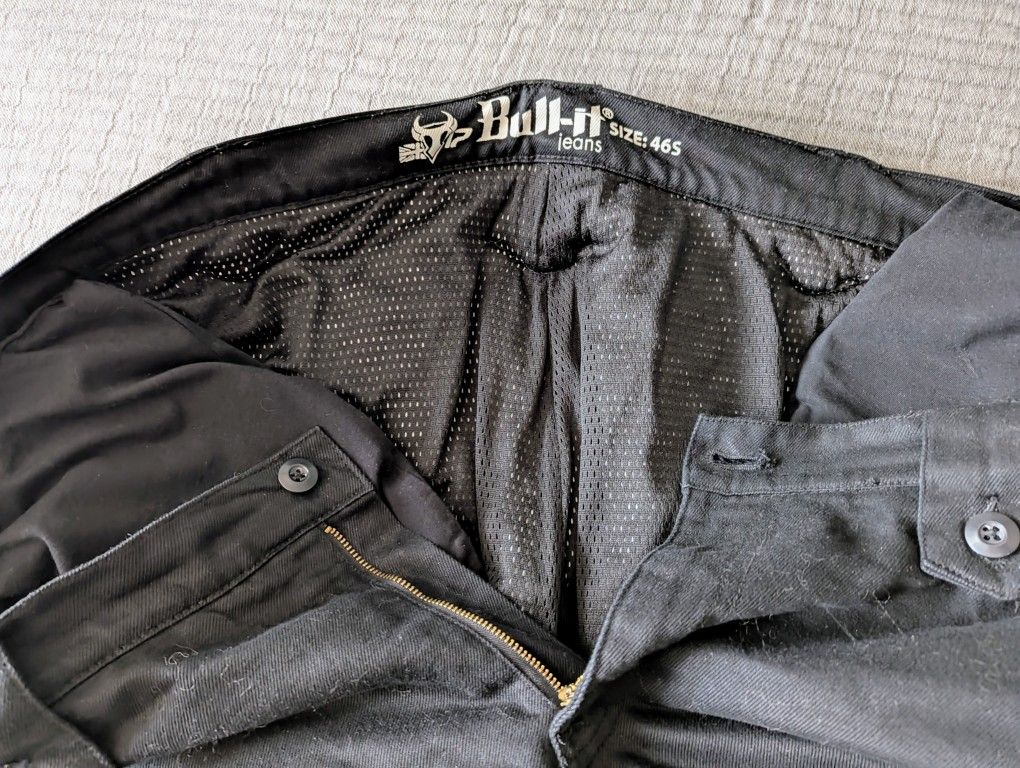 100% cotton with a dark wash and a Covec liner. Straight leg. SR6 armor on hips. Only worn a few times. Like new. size 46x30 Price is Firm.