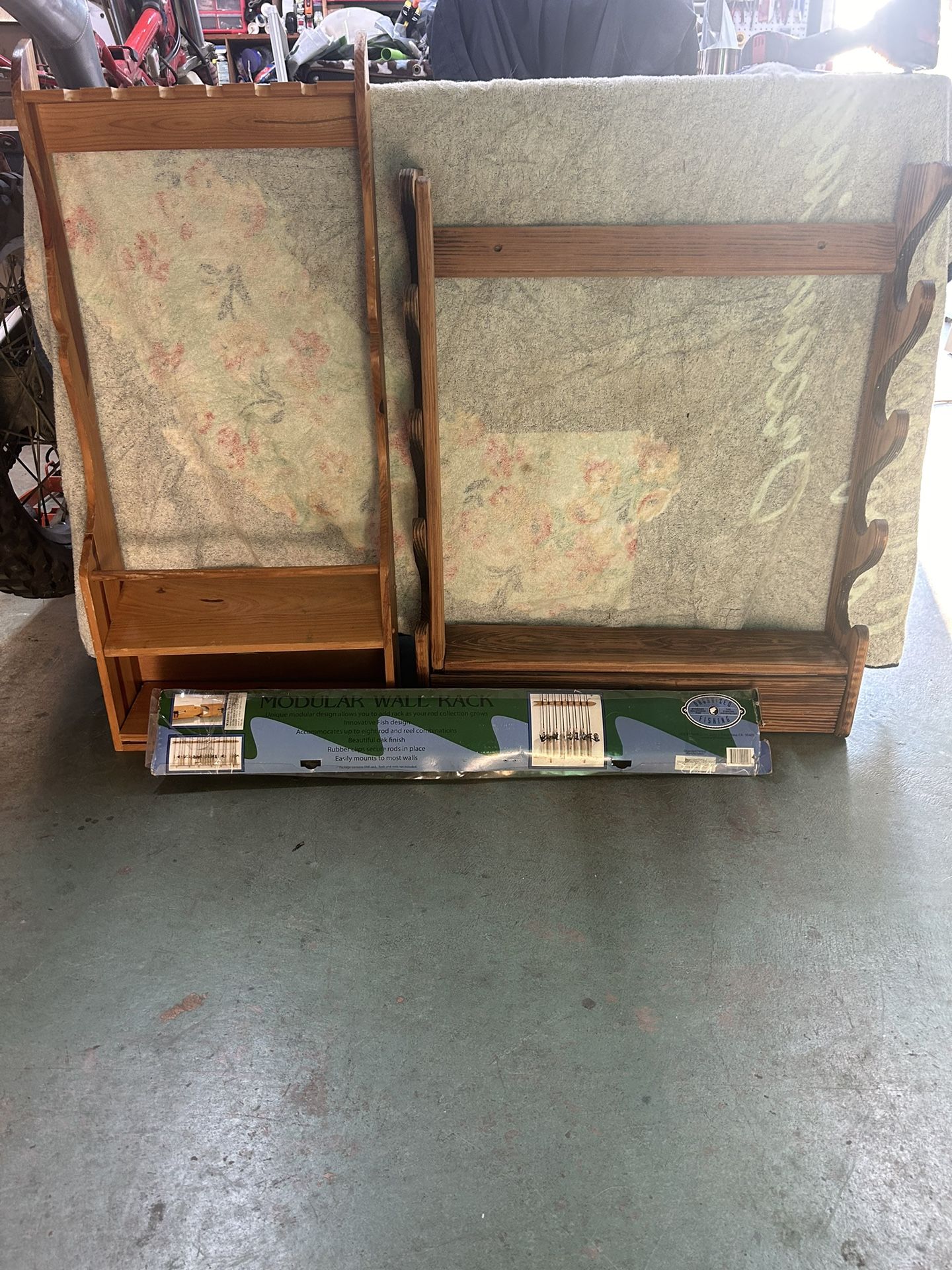 Have 2,wall mount Fish Rod Holders, one wall mount Wood Rifle Rack.
