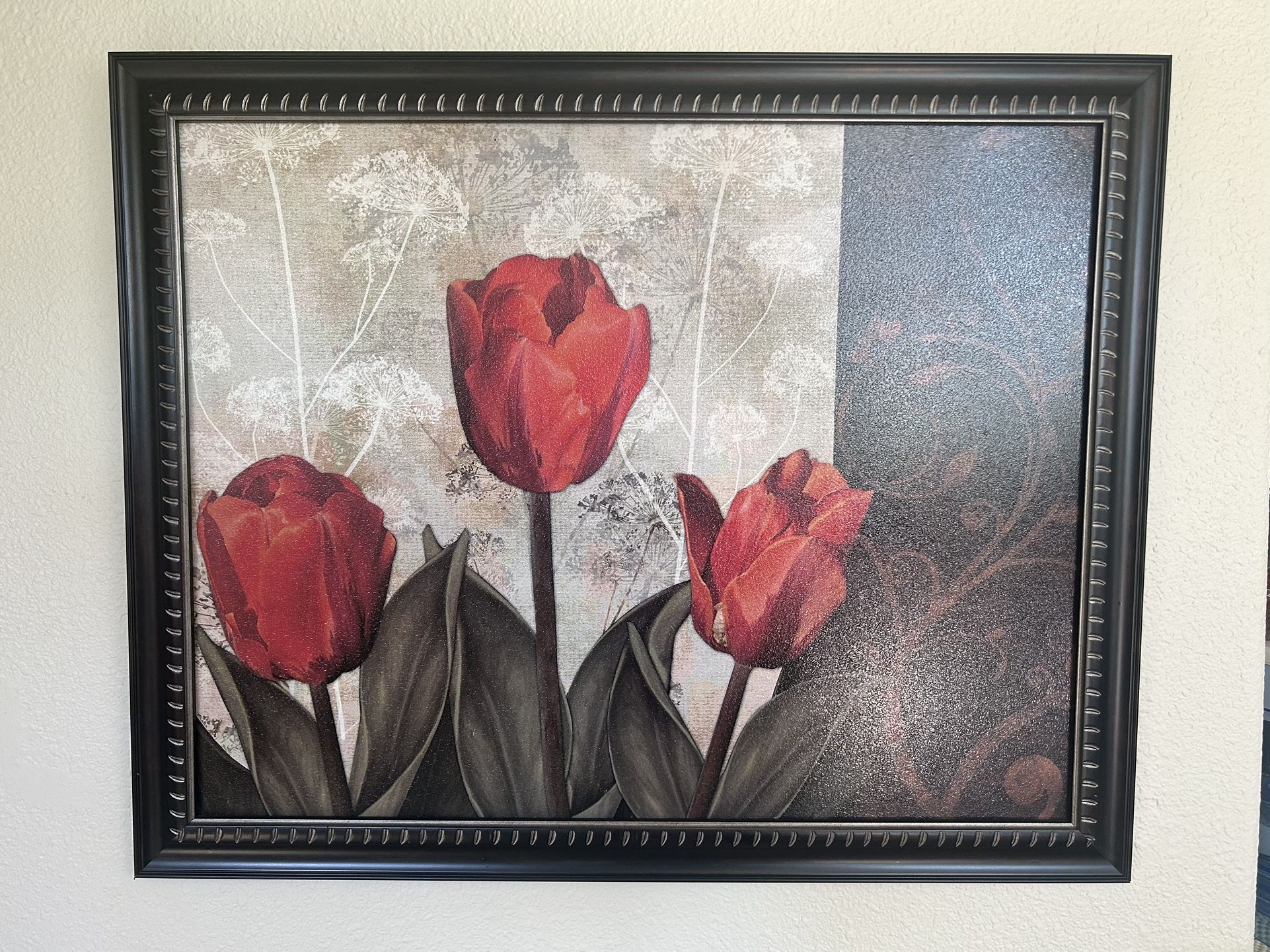 Beautiful framed floral wall art featuring red tulips with soft neutral and textured background tones. Set in a black frame with subtle detailing that gives it a timeless, elegant look. Perfect for: • Living room, bedroom, or hallway • Traditional, transitional, or contemporary décor • Adding warmth and color to a neutral space ✨ Ready to hang ✨ Frame included ✨ Very good condition 📏 Medium-to-large wall size Local pick up only
