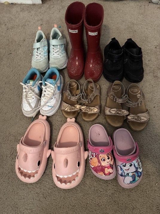Size 10 Paw patrol crocs- $10 Size 10-11 pink shark sandals- $10 Size 10 and 11 stride right open toe Sandals- $15 each Size 10 air force 1s- $15 Size 10.5 black nike shoes- $10 Size 11 Red rain boots- $20 Size 11 blue new balance- $15