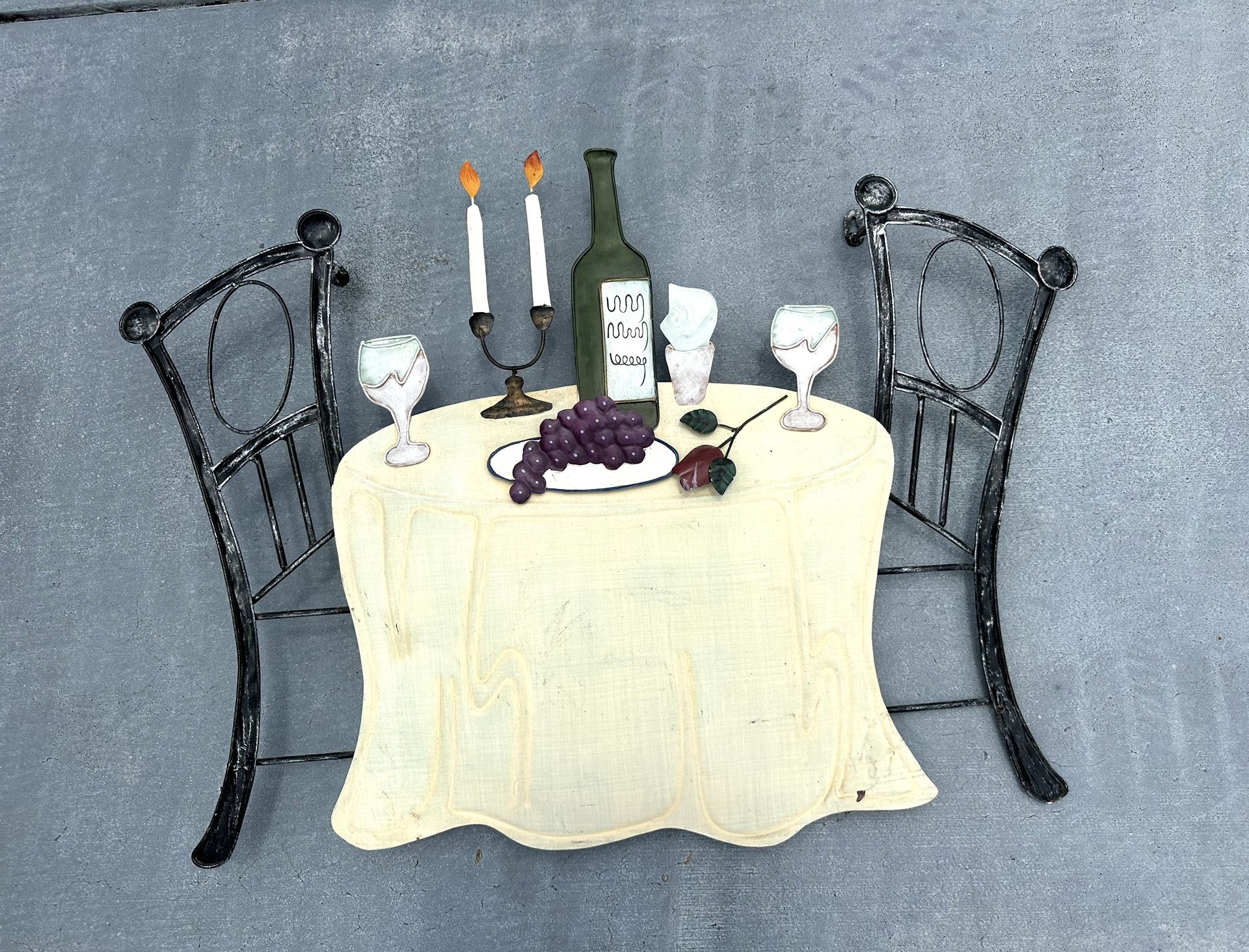 Charming wall art featuring a table with wine, glasses, and candles. Dimensions 29”Wx22”H Message for time and place to pick up. Negotiable