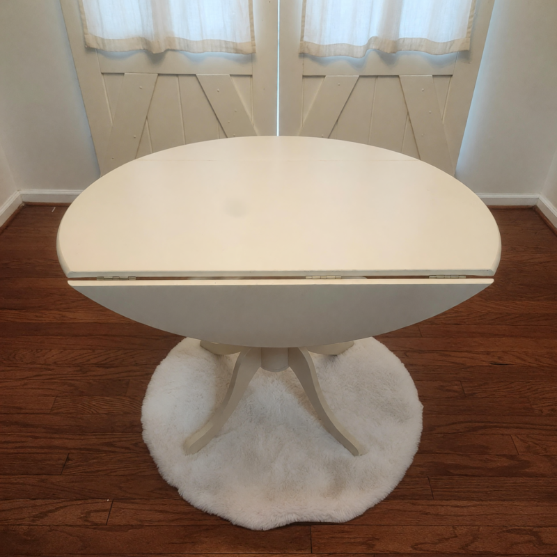 This stunning oval dining table is in like-new condition, showcasing minimal signs of wear and offering a fresh addition to any dining space. Perfectly maintained, it appears almost as if it has just come out of the box, ensuring buyers receive a high-quality piece of furniture. The table is a versatile and stylish option for family meals or intimate gatherings, ready to be the centerpiece of your dining area.\n\nCrafted from durable wood, this dining table features a beautiful linen white finish that adds a touch of elegance to any decor style. Its oval shape provides a comfortable seating capacity for up to 4 people, making it ideal for smaller spaces or cozy dinners. Additionally, the table is extendable, allowing for extra seating when needed, which enhances its functionality for hosting larger gatherings.\n\nBuyers will appreciate the thoughtful design and practical features of this dining table. The combination of its classic color and adaptable size makes it a timeless piece that can easily fit into various home aesthetics, from modern to traditional. This table is a fantastic choice for anyone looking to elevate their dining experience with a reliable and attractive furniture piece.