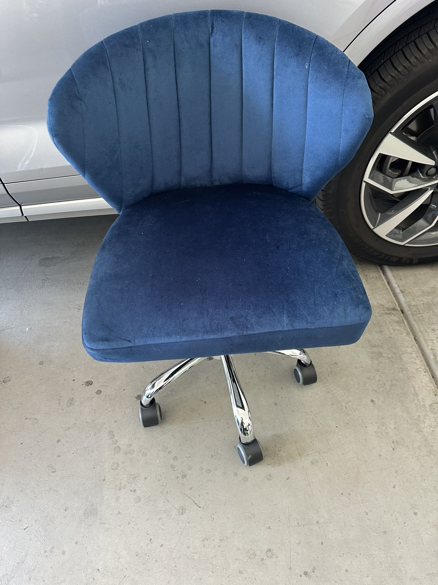 Add elegance and comfort to your space with this stylish blue velvet chair. ✨ Features: • Luxurious velvet fabric in rich blue • Comfortable padded seat and backrest • 360° swivel with chrome base • Adjustable height – great for desks or vanities • Gently used and in excellent condition Chic and functional, this chair fits perfectly in any modern home office, bedroom, or glam station.