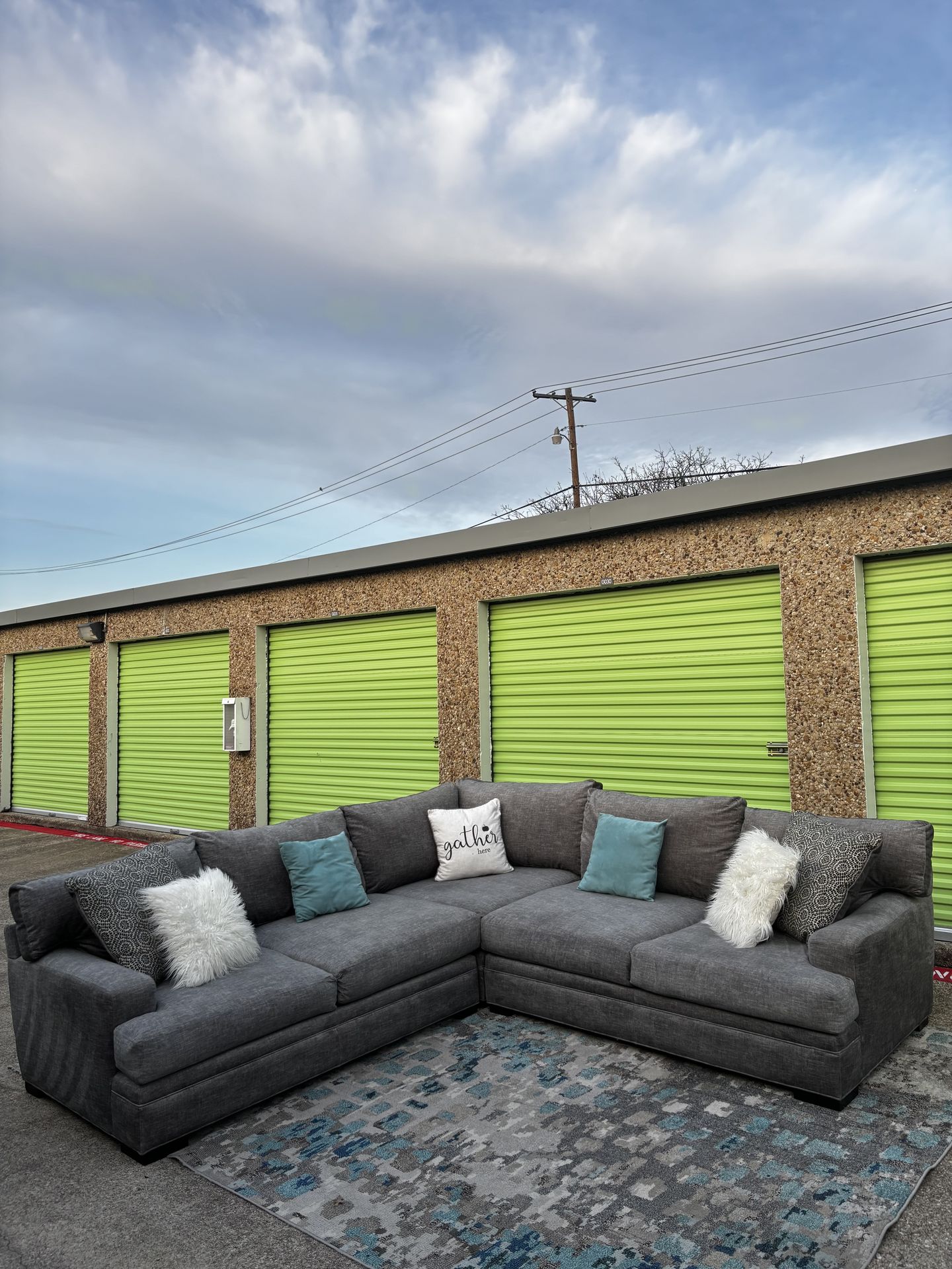 Cindy Crawford Home oversized sectional in beautiful gray fabric. Very comfortable with deep seating and modern design. Perfect for a living room or family room. ✔ Clean and well kept ✔ No rips or stains ✔ Smoke/pet free home ✔ Very spacious and comfortable Curbside delivery available (fee applies) Payments in person only Pillows/rug not included (does come with a couple of the yellow/gold/gray pillows from the website photo )