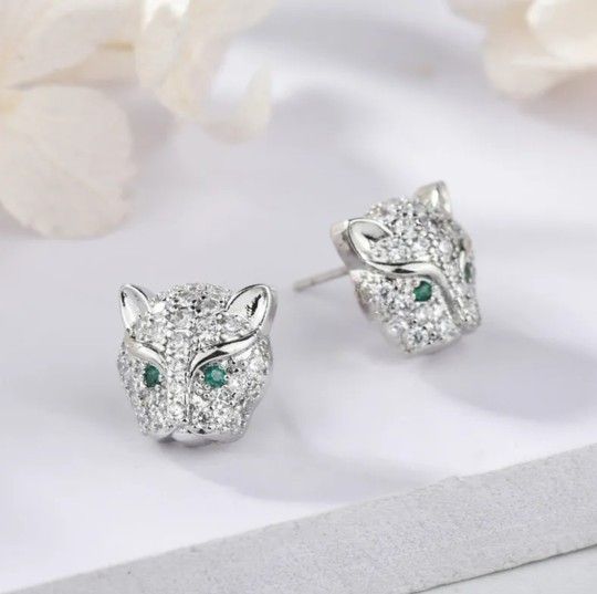 Vert beautiful and unique Style Leopard head earrings diamond Emerald/zircon and green eye fashion jewelry. There are no real diamonds on there. If you have any questions, ask me if you feel free . same has pictures Daily wearing earrings very comfortable ang lightweight. Material....copper /brass Color ... white/ silver