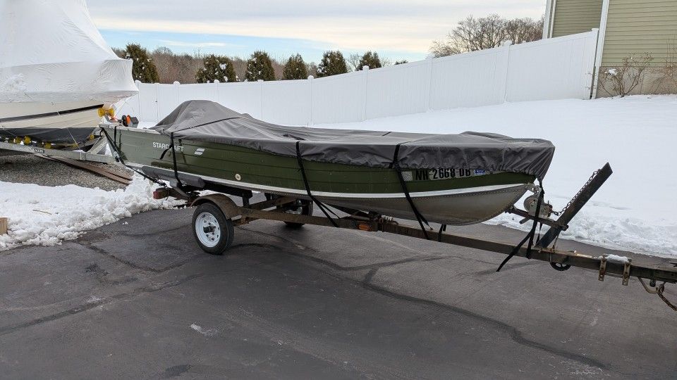 1978 Starcraft Seafarer 14 Foot Aluminum Boat and trailer Make me an offer. As the season nears I will continue to work on the boat and trailer. The asking price will be adjusted accordingly. The boat and trailer need some work. I have the title for the boat. The boat does take in a little bit of water. Has a livewell and bilge pump. The boat was just registered in MA. The EVA foam is lifted in most places. The trailer has new tires with Bearing Buddies. Some rollers need to be replaced and the bow stop needs to be replaced. The lights currently do not work.
