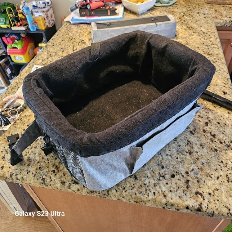 Small dog car booster seat. In perfect condition. We just got another puppy and needed a bigger one. Holds up to a 12 to 15 pound pup. Has a safety strap. Great for dogs to be able to see out the window while traveling.