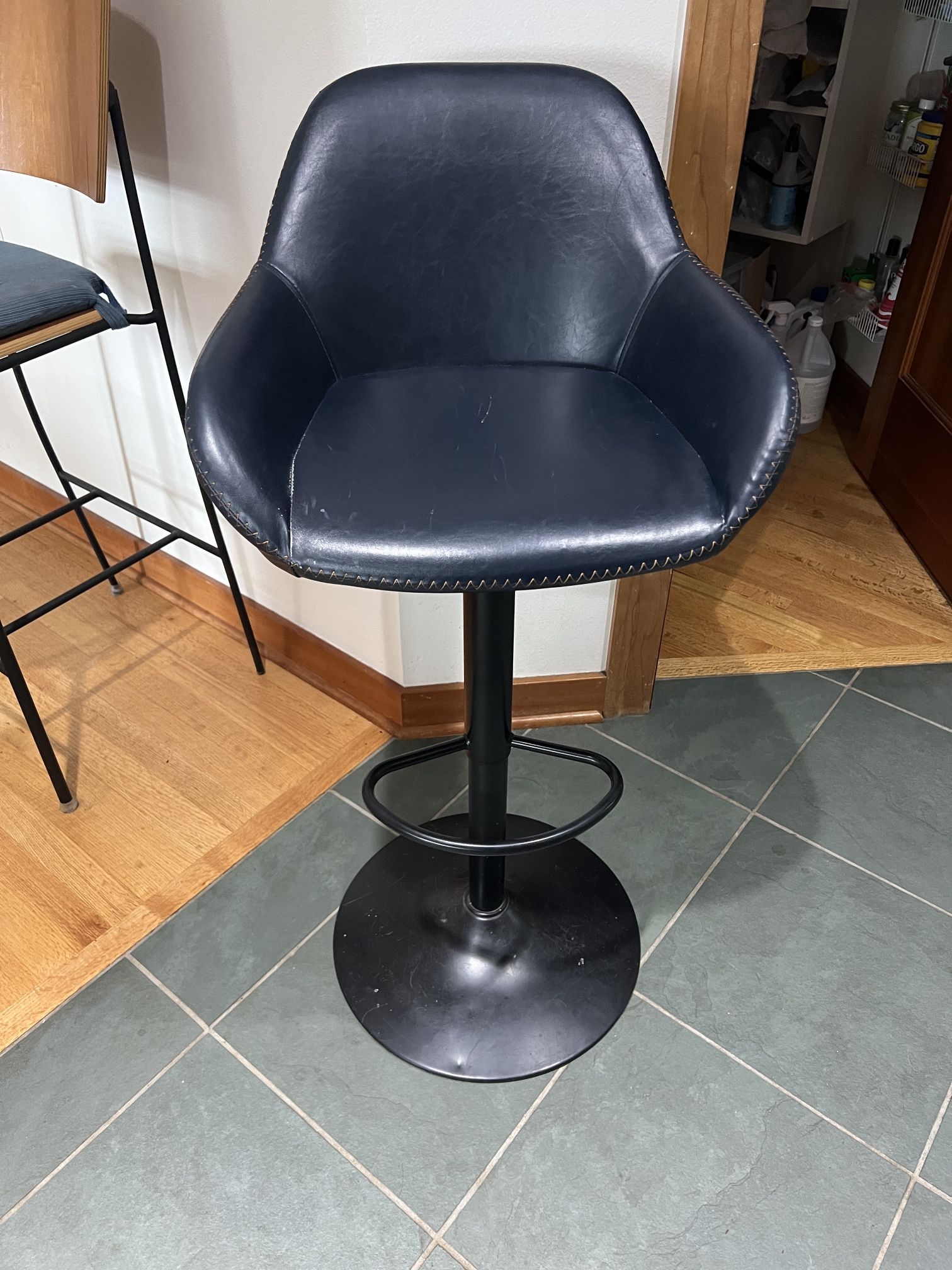 Pair of blue matching barstools with back rest. Adjustable height. Some scratches on one stool which I have included in the photos. Max seat height 32”, minimum seat height 24”. Metal base is 18”. Priced for the pair.