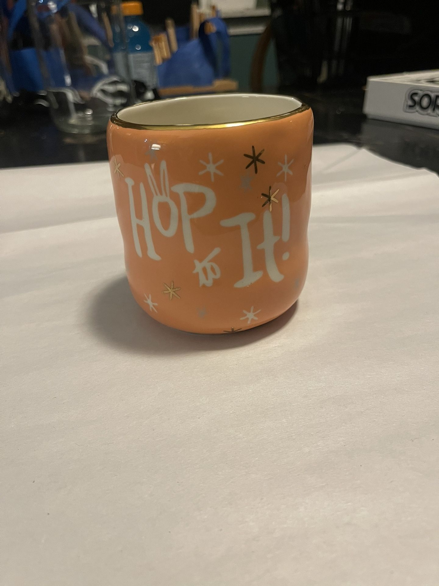 Happy Easter "HOP TO IT !", and Stars Ceramic Cup Gold Rimmed Flower Pot 4”tall 3.5 diameter . Great preowned condition