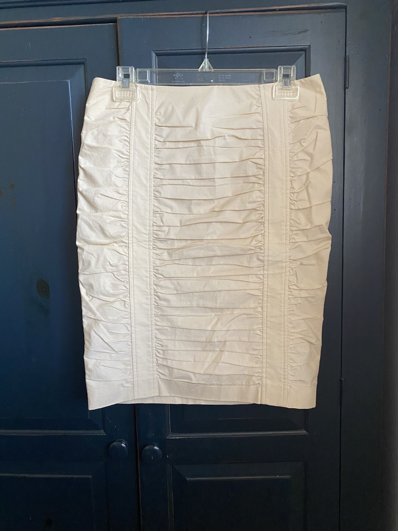 Women’s BEBE Cotton/Spandex Cream Color Front Pleated Lined Skirt… Size 6. Waist-29”. Length 20 1/2”