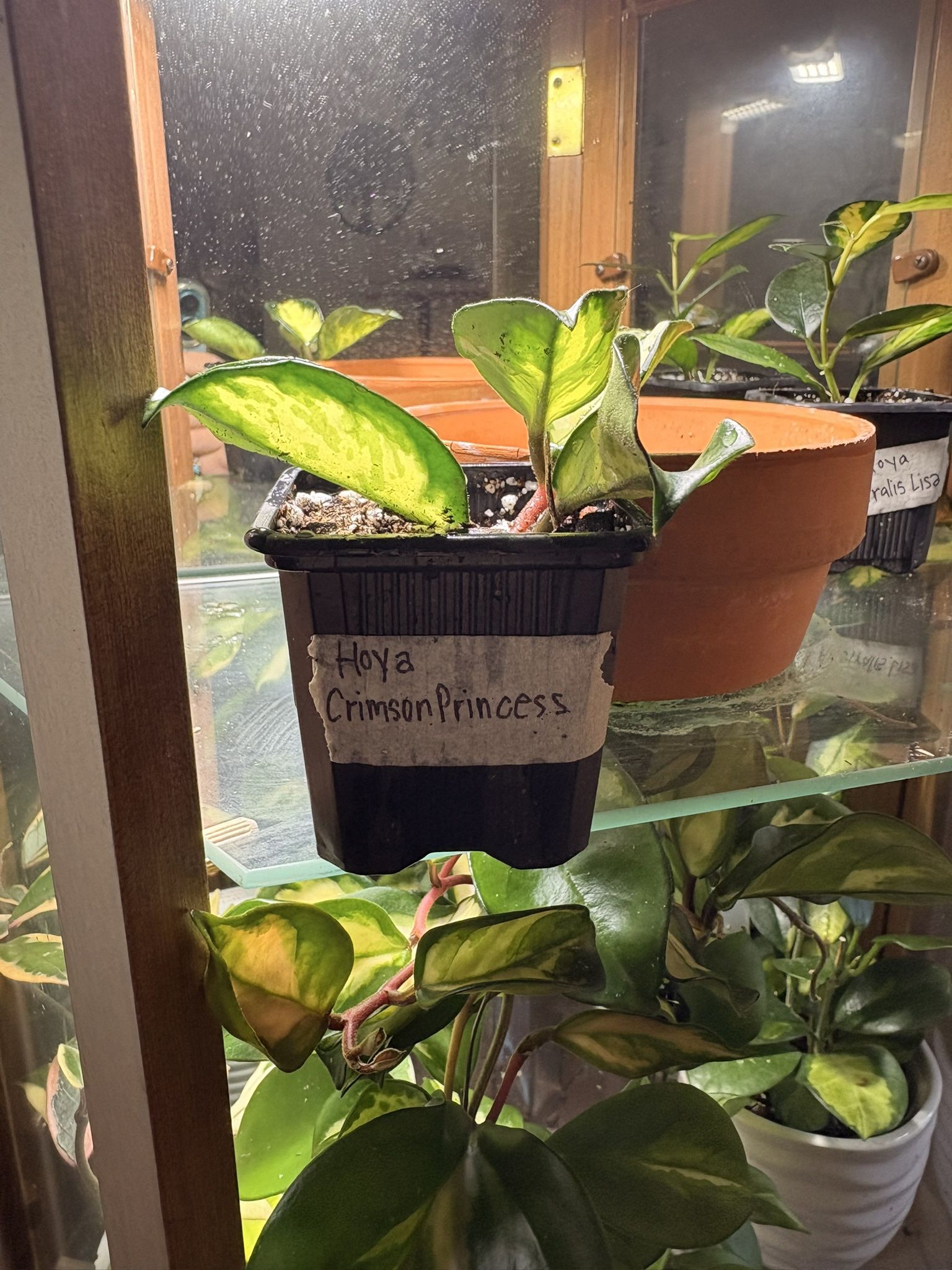 Beautiful young Hoya Crimson Princess ready to grow! This variegated beauty shows off creamy pink and green leaves, and when mature, produces clusters of sweetly scented blooms. Easy-care and perfect for bright, indirect light. Mother plant pictured last for reference Will ship upon request