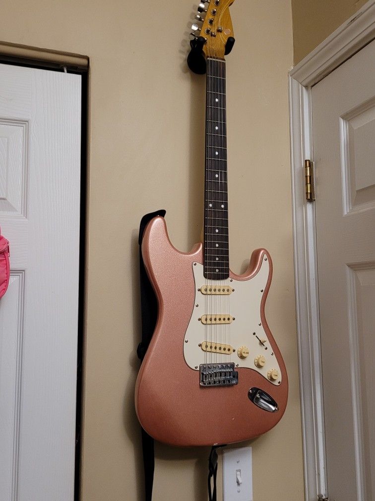 Practically brand new, hardly used 💔, seeing these things collect dust hurts and would love to see these find a new home. Pink Guitar is made from spare laying parts, Squirecaster is very light and is missing the high e string (easily replaceable) Rise (Black guitar) also very light and very nice. [Cables all included] ● PRICE IS NEGOTIABLE•