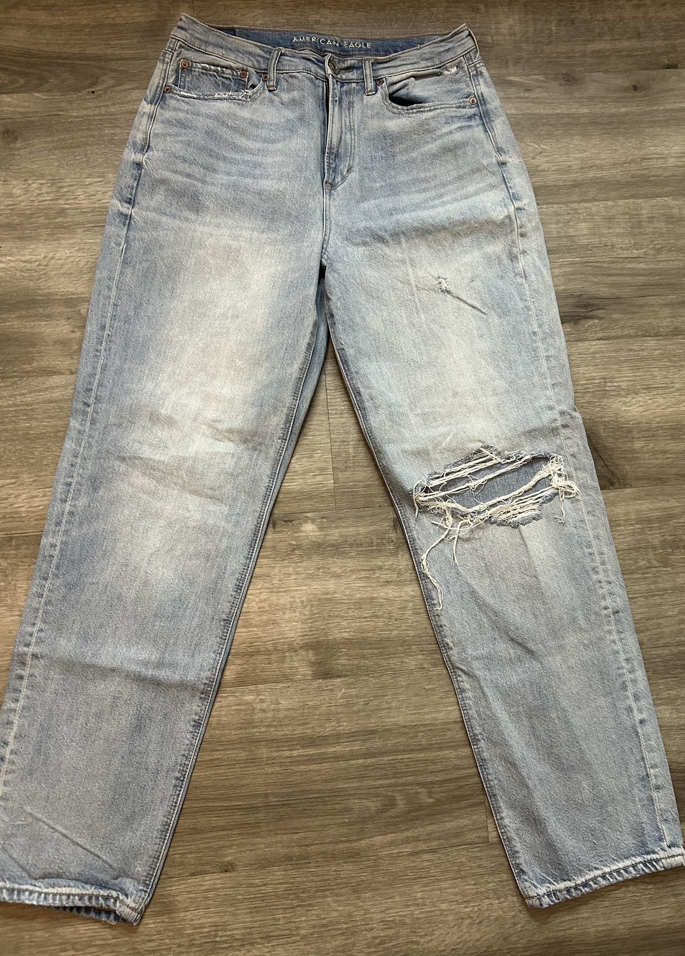 Straight leg x-long Size : 10 Worn twice Distressed on left knee Medium wash