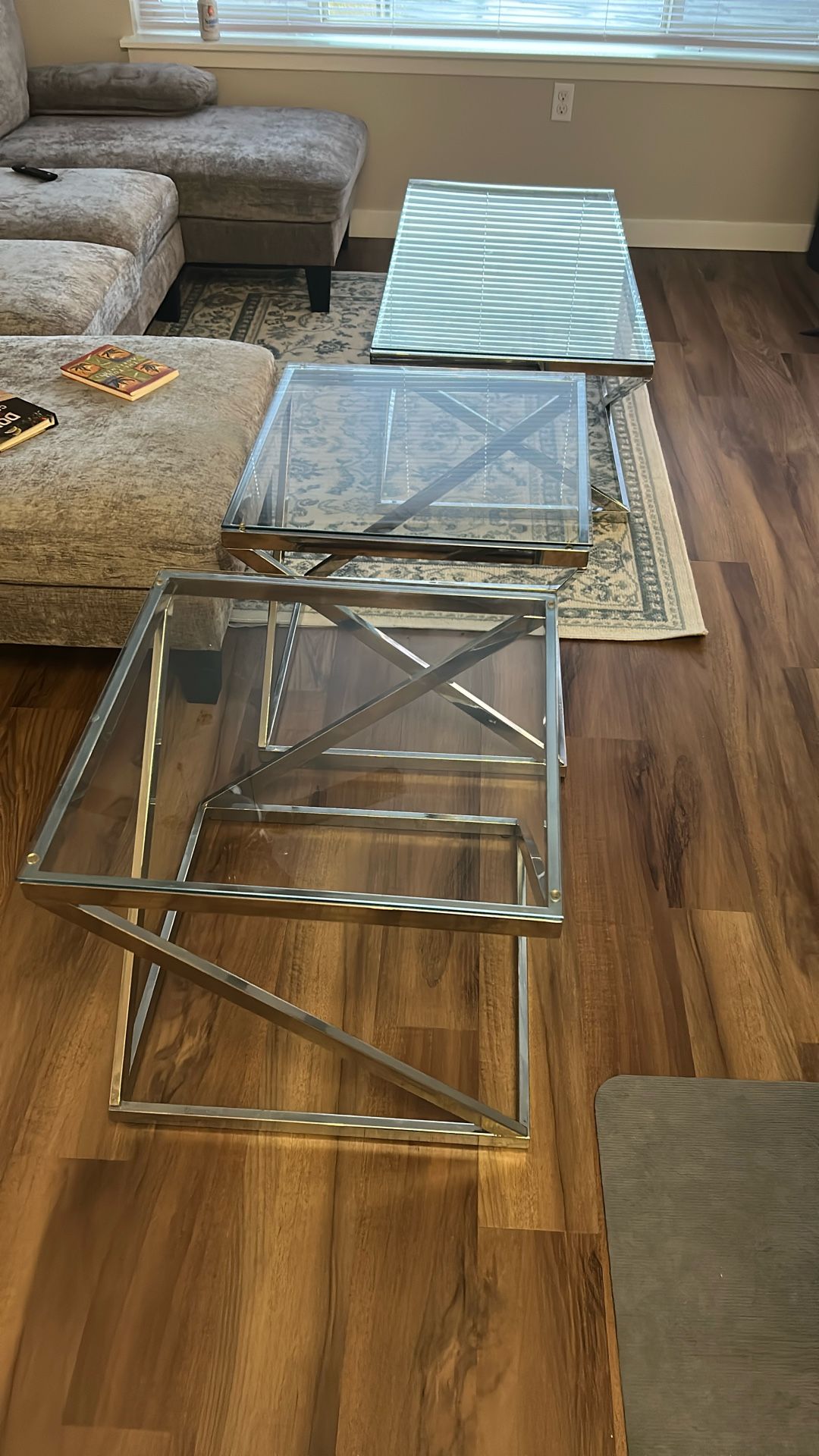Glass coffee table and 2 end tables. Glass coffee table has tiny chip on it. Coffee table 48x24. End tables 22x22. Looking to sell ASAP.