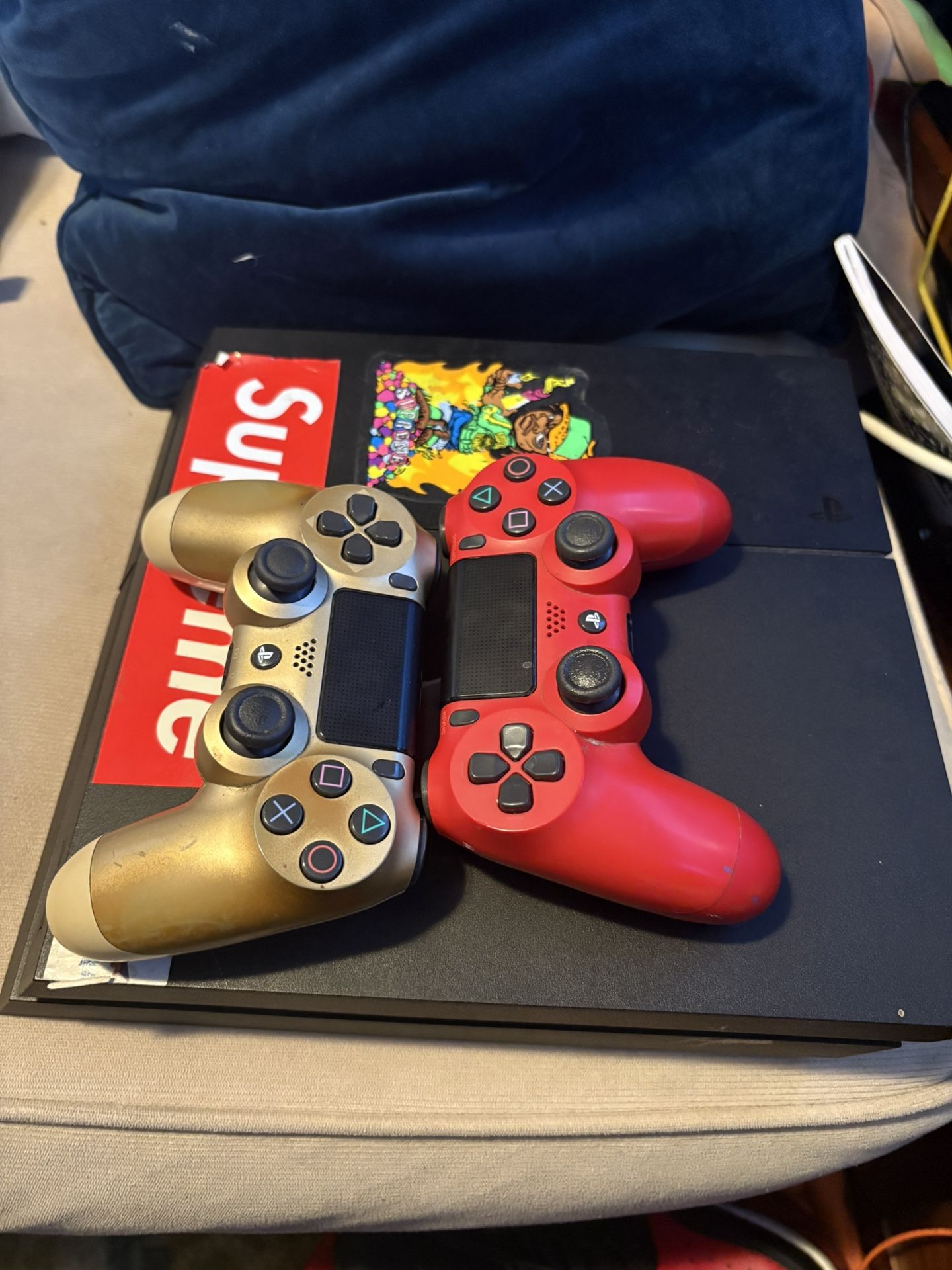 PlayStation 4 with two controllers no cords . Works great controllers work great no stick drift Device does require cleaning but once it’s clean it works perfect