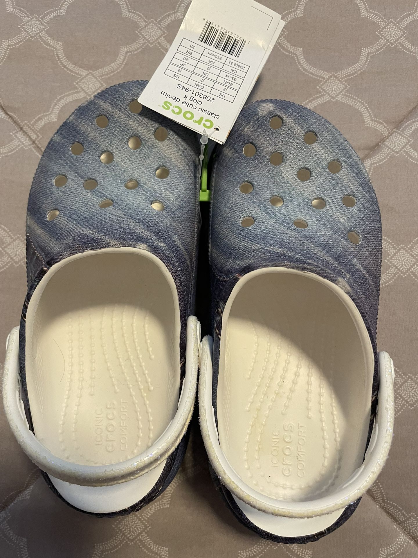 Brand new never worn crocs with tags. The heel straps have a sparkly detail that makes these clogs extra fun. Crocs classic cutie denim clog in kids size j2.
