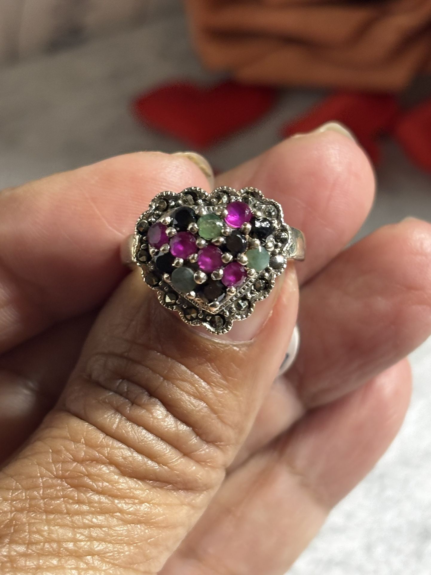 REAL RUBY BLUE SAPPHIRE-EMERALD-MARCASITE SILVER RHODIUM OVER RING SIZE 7 NEW WITHOUT TAGS