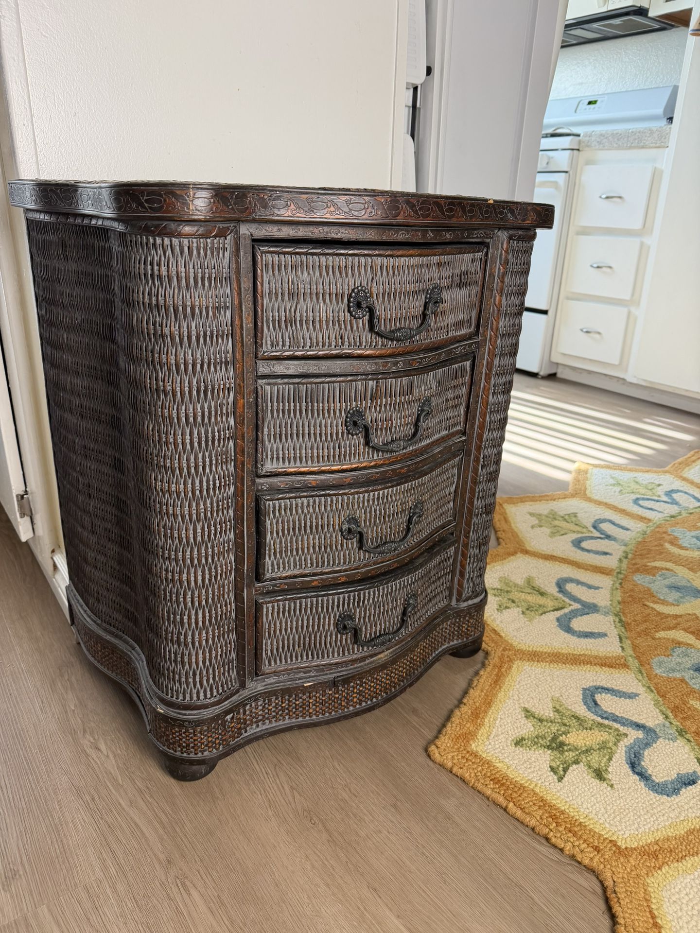 Small four drawer dresser with beautiful design Dark brown wicker H x W x D - 26 x 23 x 16” at the widest points Some minor chips here and there, you can see in the photos
